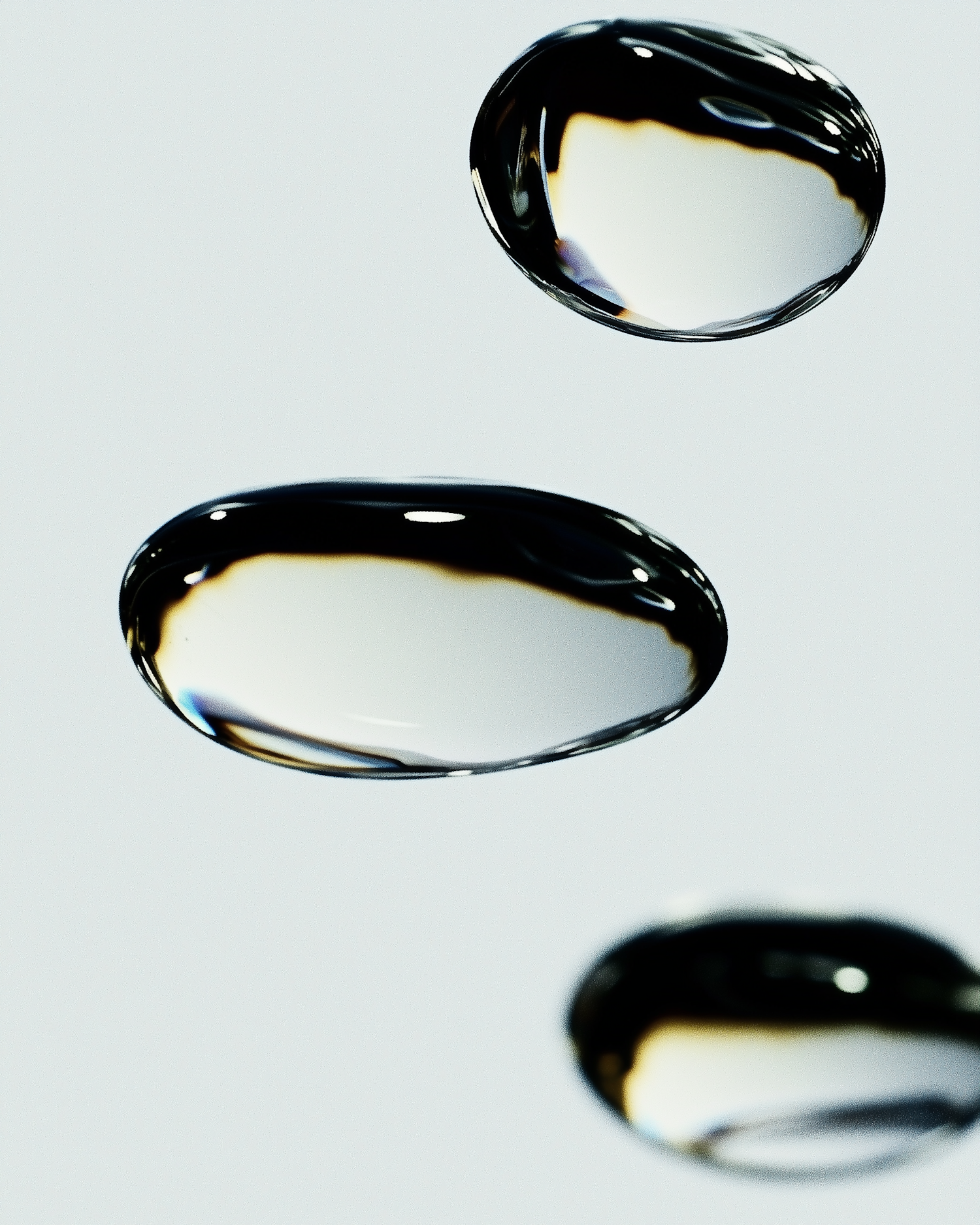 Close-up of three glossy liquid droplets floating against a light background, reflecting dark and golden hues.