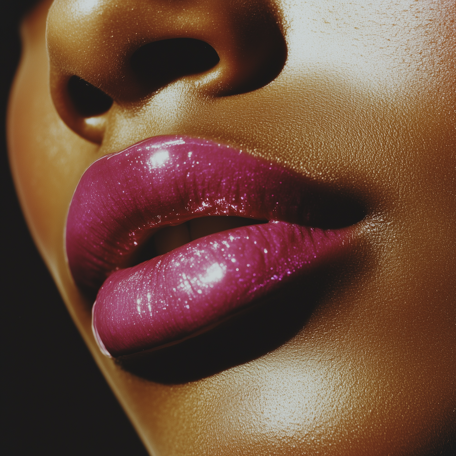 Close-up of glossy magenta lips on radiant dark skin, highlighting shimmer and texture with a dramatic, elegant focus.