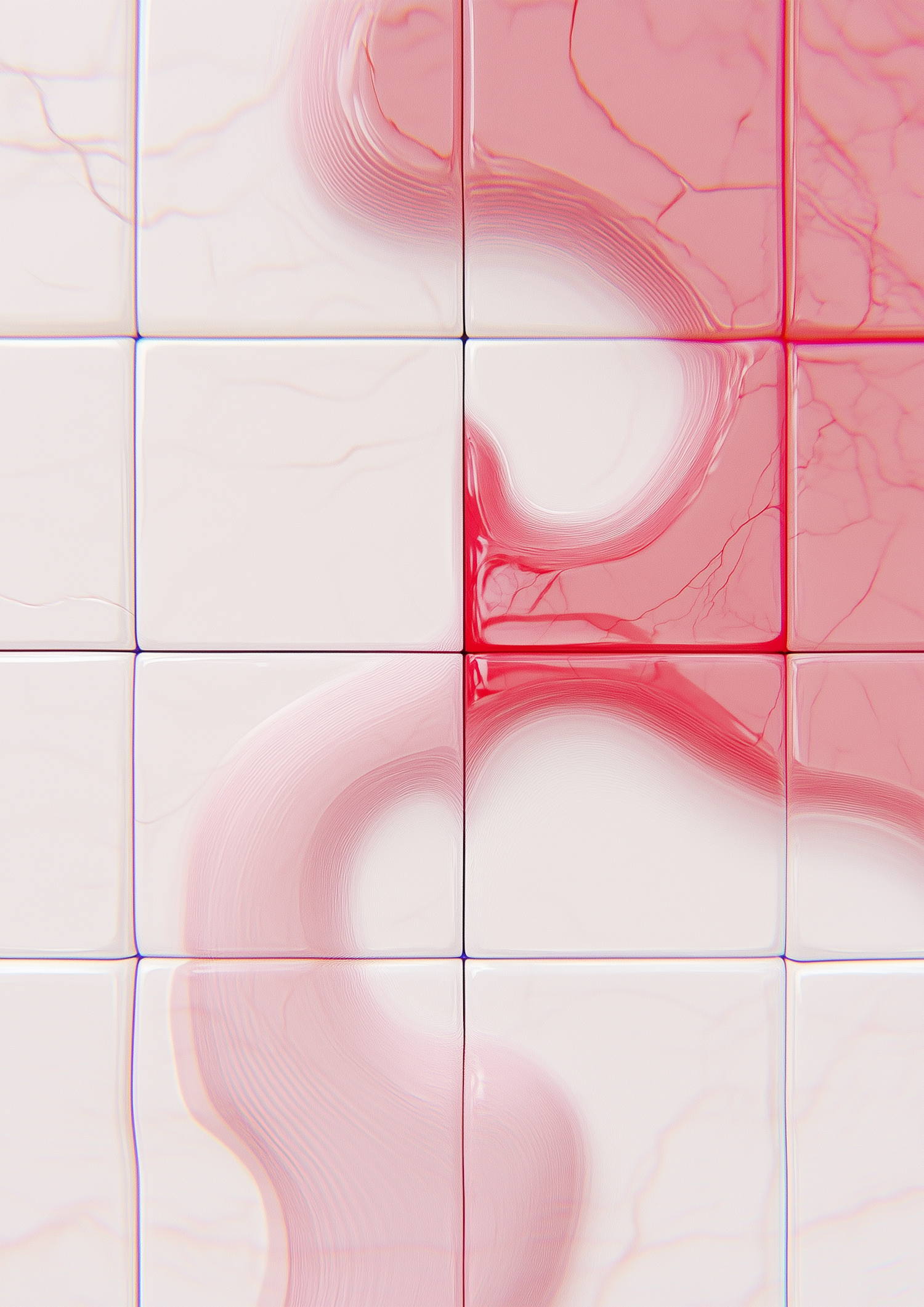Glossy white tiles with pink and red swirls, creating a fluid, marble-like abstract design. Perfect for modern decor or architectural accents.