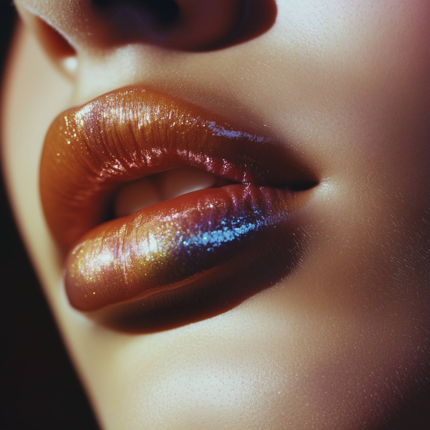 Close-up of glossy lips with metallic gold, bronze, and blue hues, creating a shimmering, artistic look. Perfect for beauty inspiration.