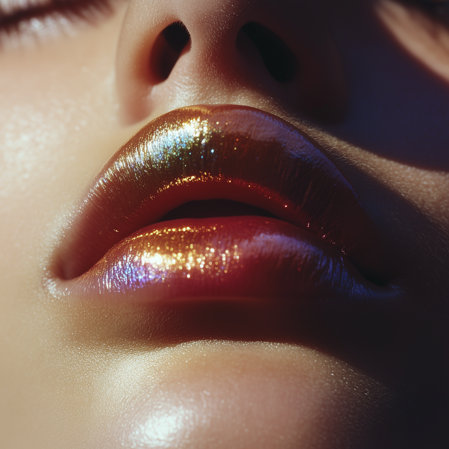 Close-up of glossy metallic lips with gold and iridescent hues, slightly parted, against a smooth, glowing skin background.