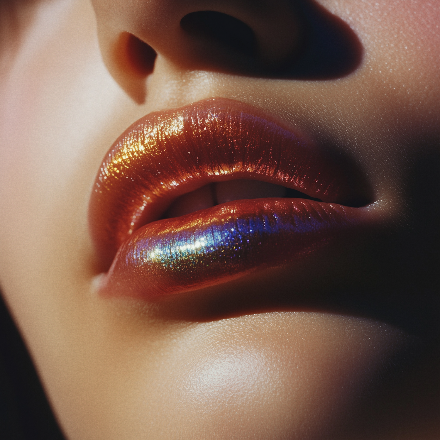 Close-up of glossy metallic lips with a stunning gold, bronze, and blue gradient, reflecting light beautifully. Perfect for beauty inspiration.