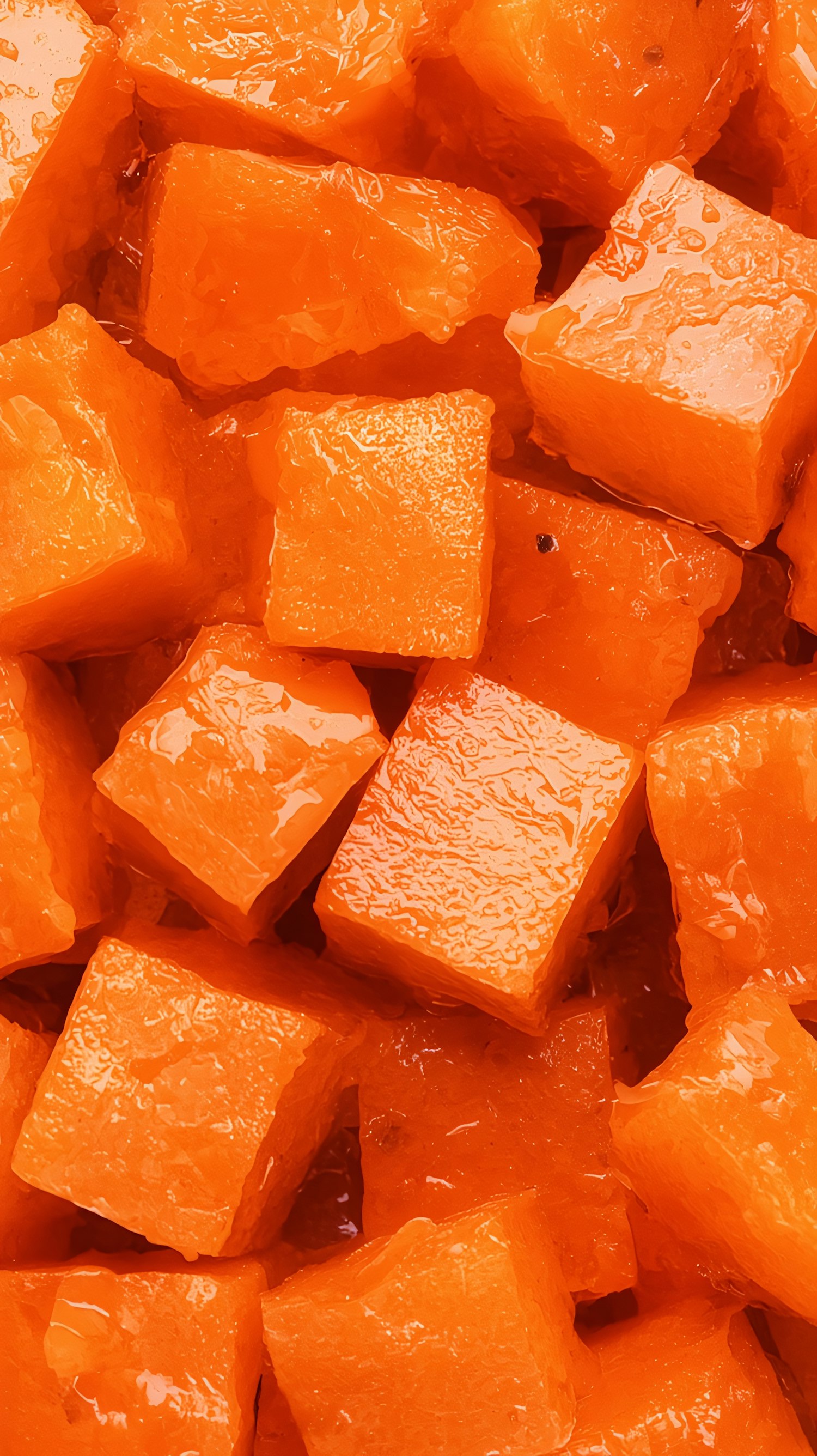 Close-up of glossy orange cubes, likely fruit pieces, with a shiny texture and vibrant color, arranged randomly in a tight frame.