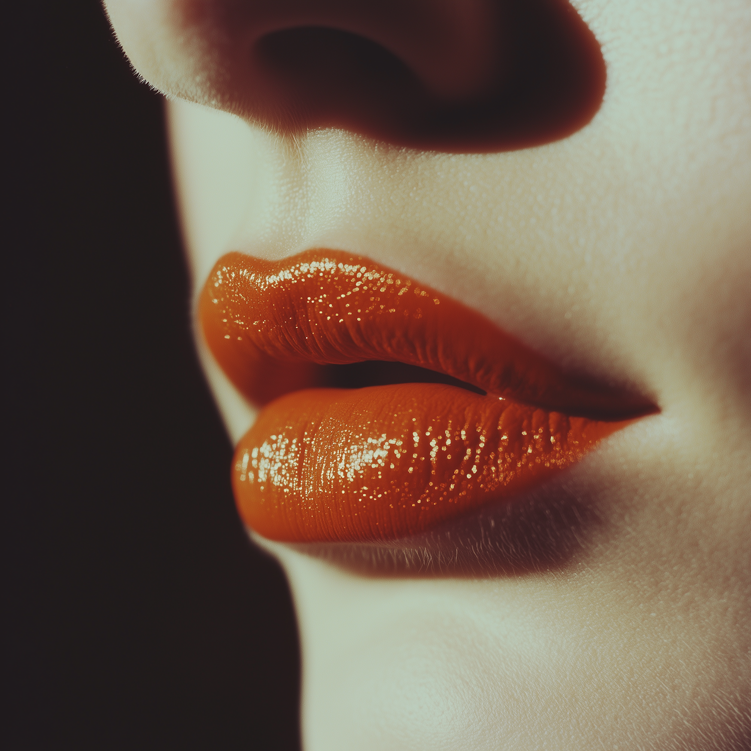 Close-up of glossy orange lips with a smooth complexion, highlighted against a dark background for a bold and vibrant look.
