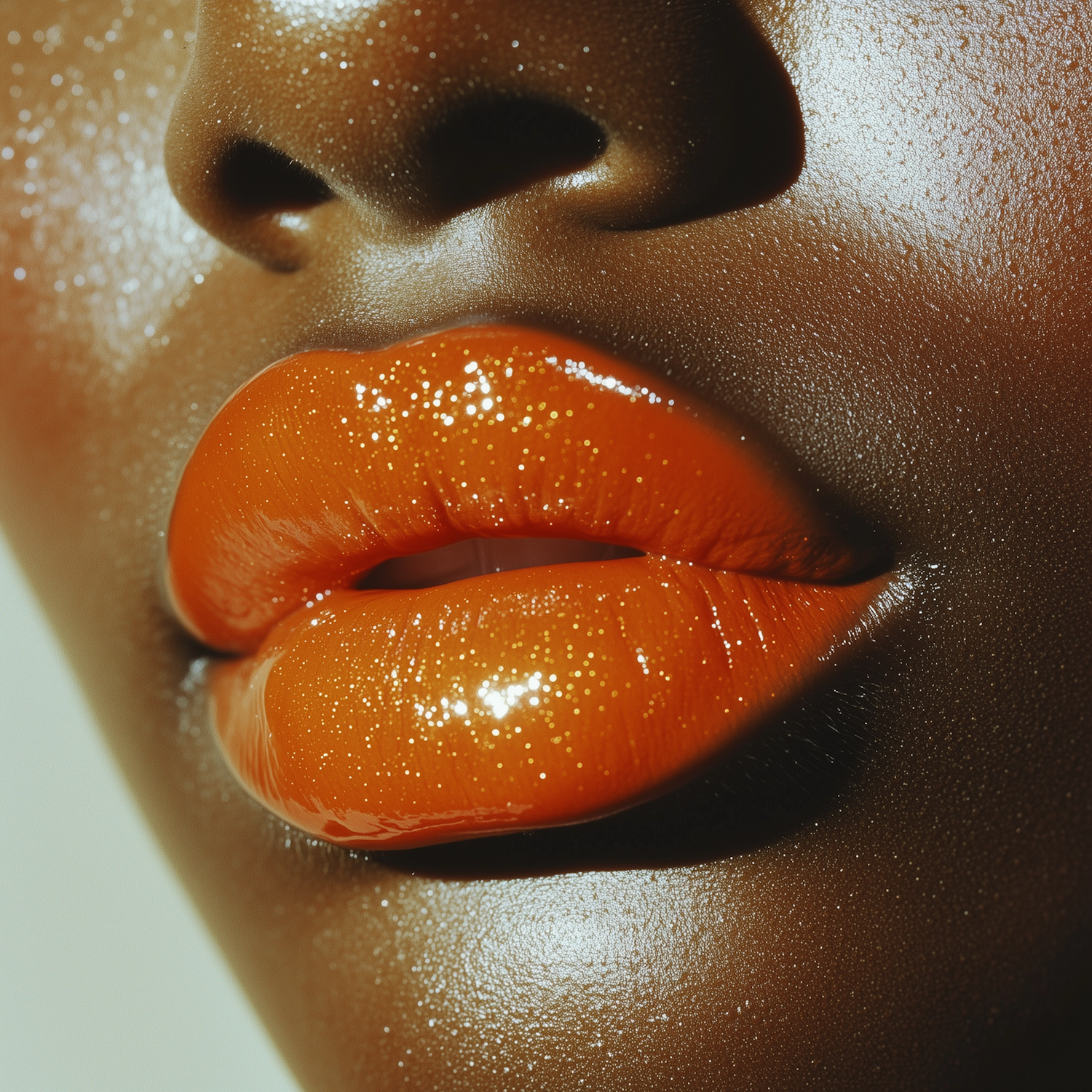 Close-up of glossy orange lips on radiant dark brown skin, with shimmering details and a dewy, glowing texture.