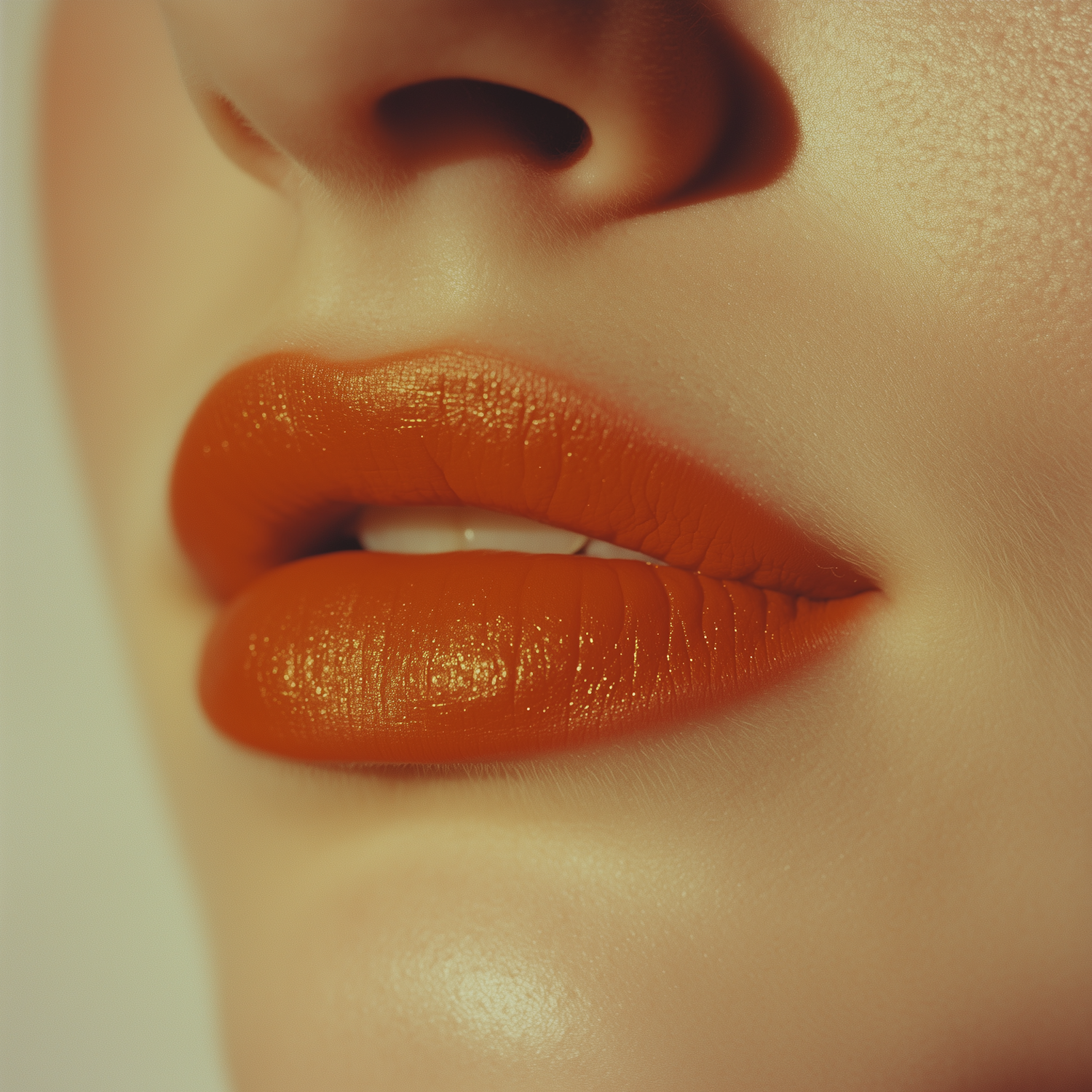 Close-up of glossy orange lips with smooth fair skin, showcasing vibrant makeup and natural texture in warm lighting.