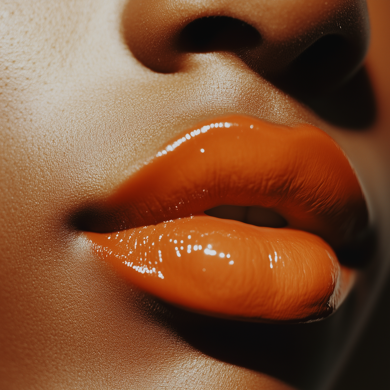 Close-up of glossy orange lips on deep brown skin, showcasing vibrant color and smooth texture with striking light reflections.