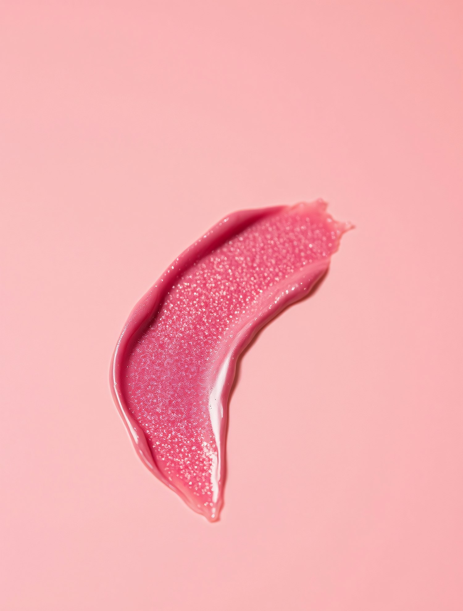 Glossy pink lip gloss smear with shimmering sparkles on a matching pink background, creating a luxurious and cohesive visual.