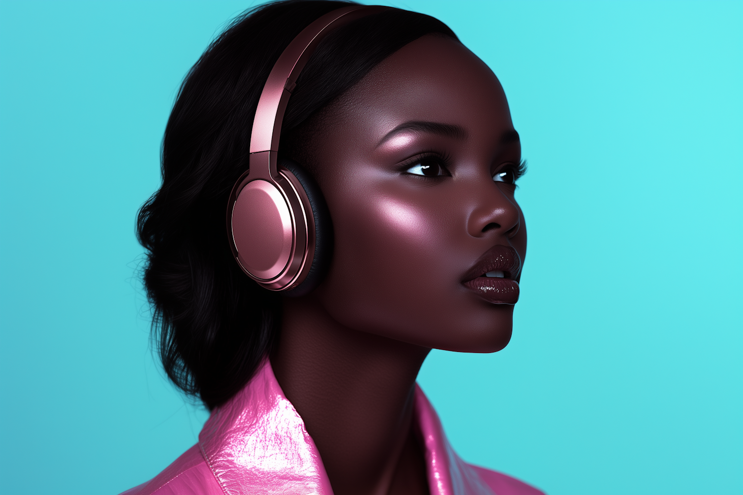Stylish portrait of a woman with metallic pink headphones and jacket against a vibrant turquoise background.