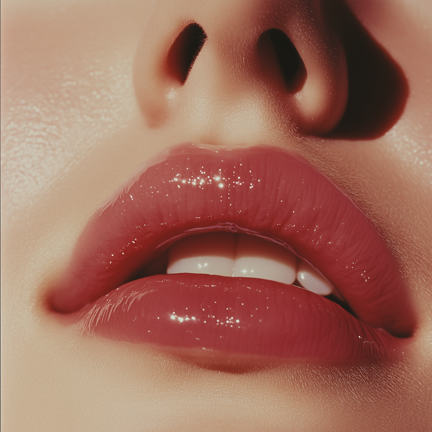 Close-up of glossy, pink lips with a natural shine and smooth skin texture, highlighting their plump and moisturized appearance.