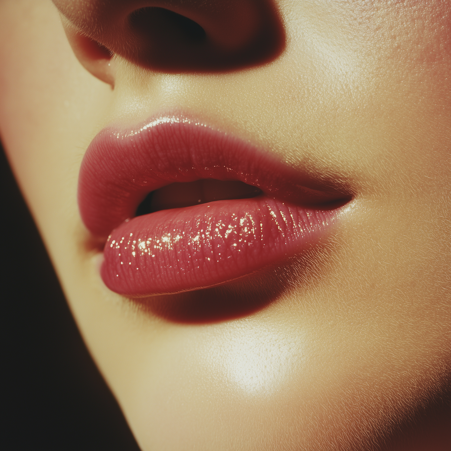 Close-up of glossy pink lips with a flawless golden complexion, highlighting hydration and shine against a dark background.