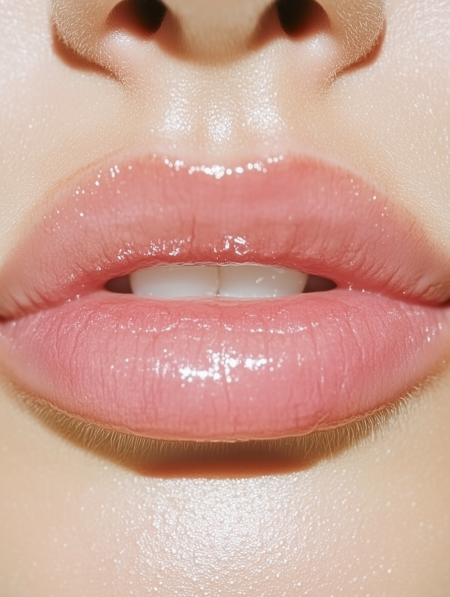 Close-up of glossy pink lips with smooth skin, highlighting natural texture and light reflection. Perfect for beauty or skincare themes.