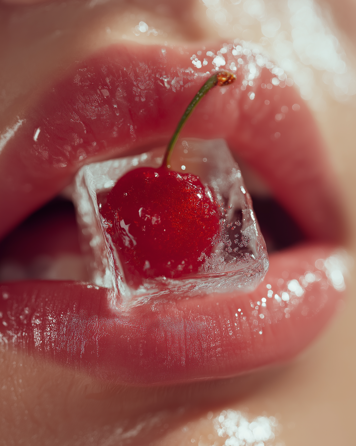 A macro shot of pink lips with an ice cube holding a red cherry, emphasizing detail and color in a luxurious composition.