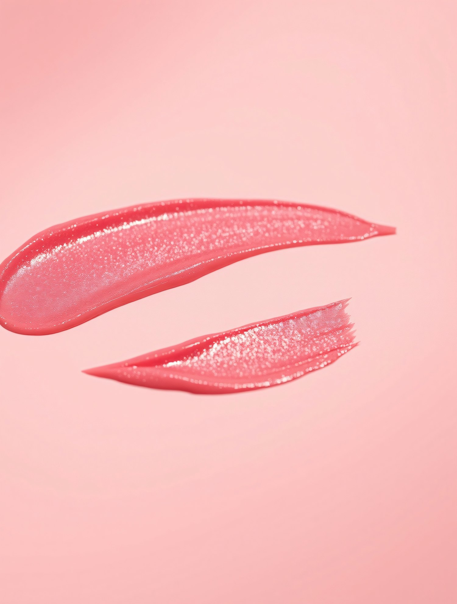 Glossy pink lip gloss swatches on a soft pink background, showcasing texture and shine.