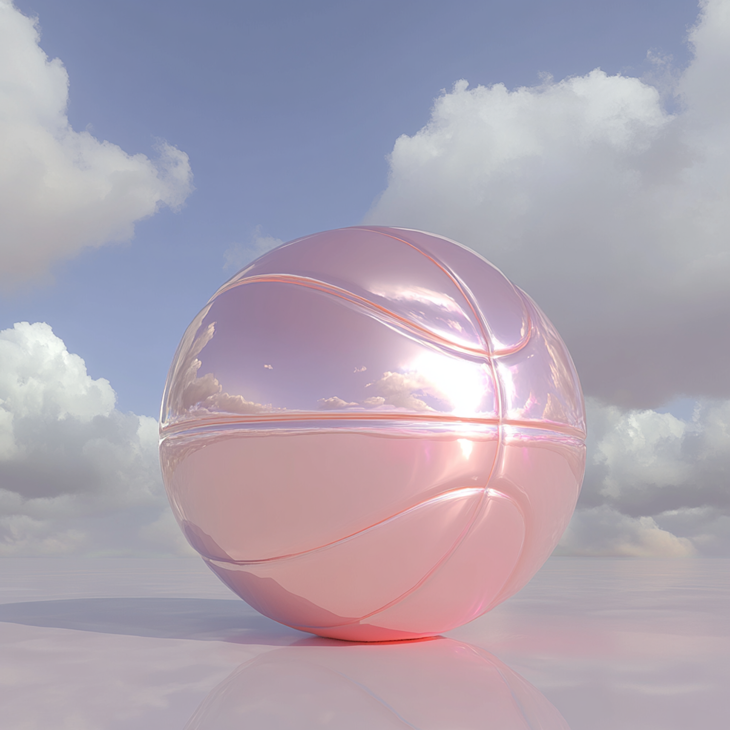 A glossy pink basketball-like sphere reflecting a dreamy sky with clouds, set in a minimalistic and surreal 3D-rendered scene.