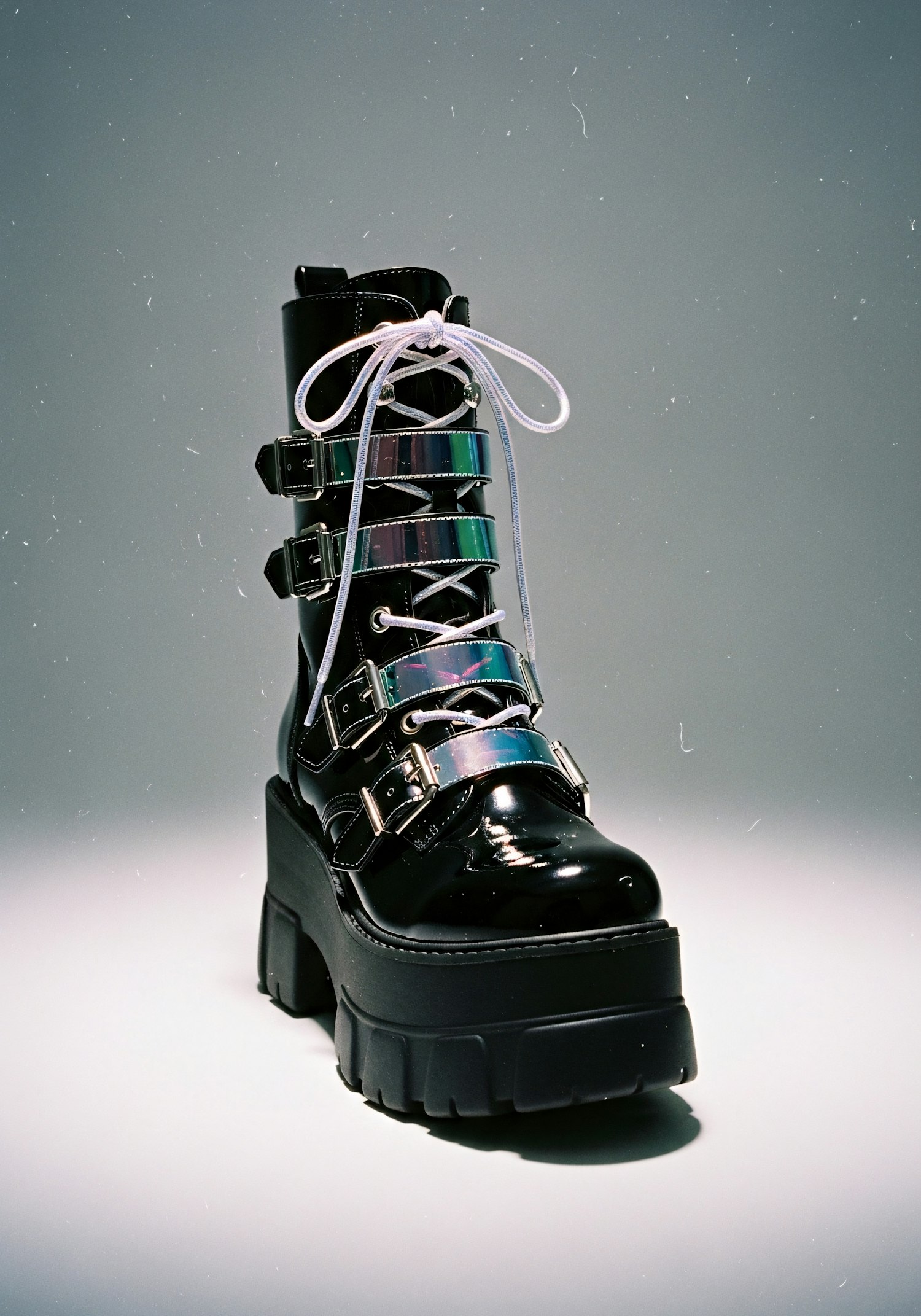 Stylish black platform boot with glossy finish, metallic buckles, and white laces, perfect for a bold and modern look.