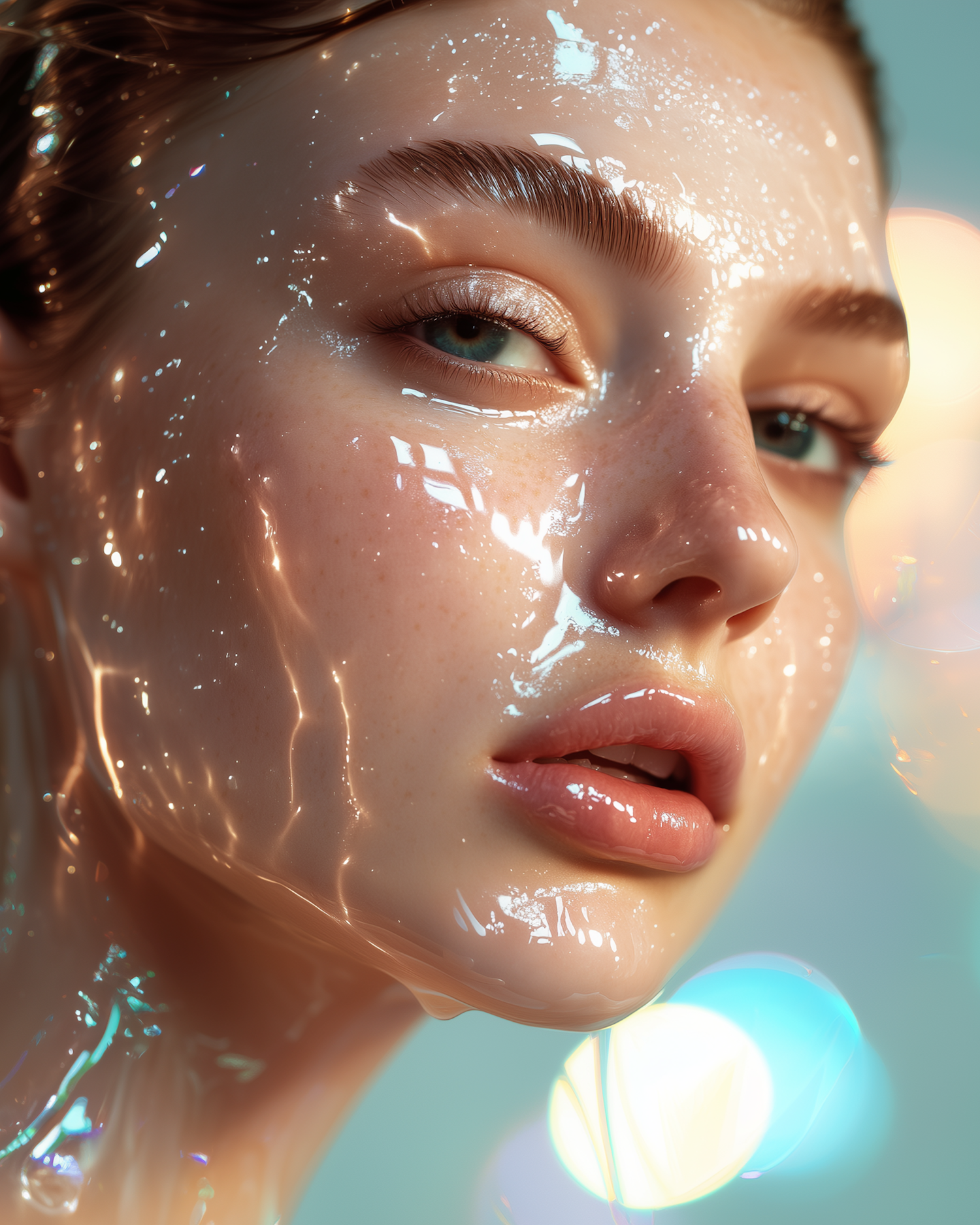 Close-up of a woman's glossy, glowing skin with dreamy bokeh lights in the background, creating a surreal and ethereal vibe.