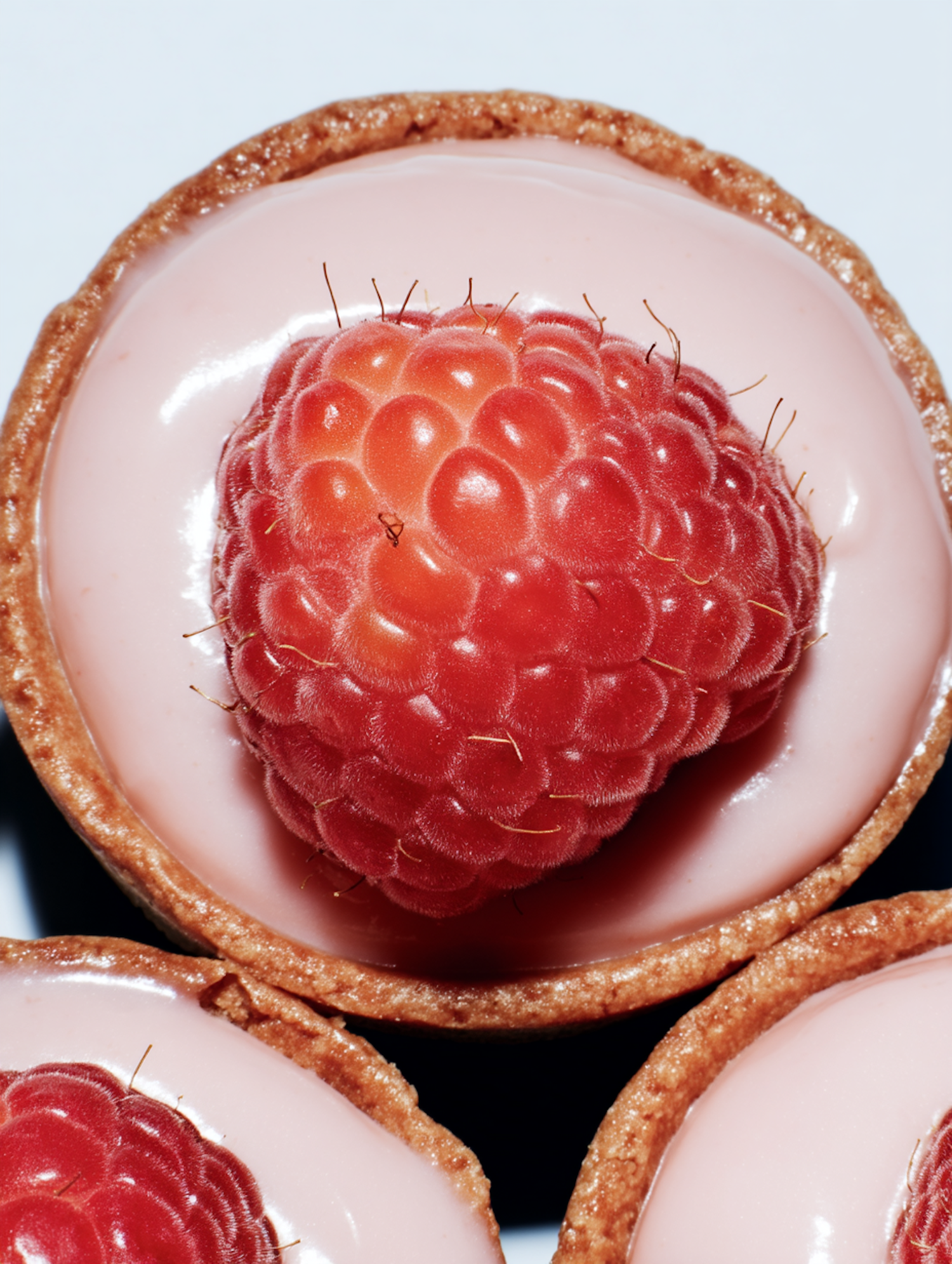 Close-up of a raspberry tart with pink cream and golden crust, showcasing vibrant colors and rich textures in a minimal white background.