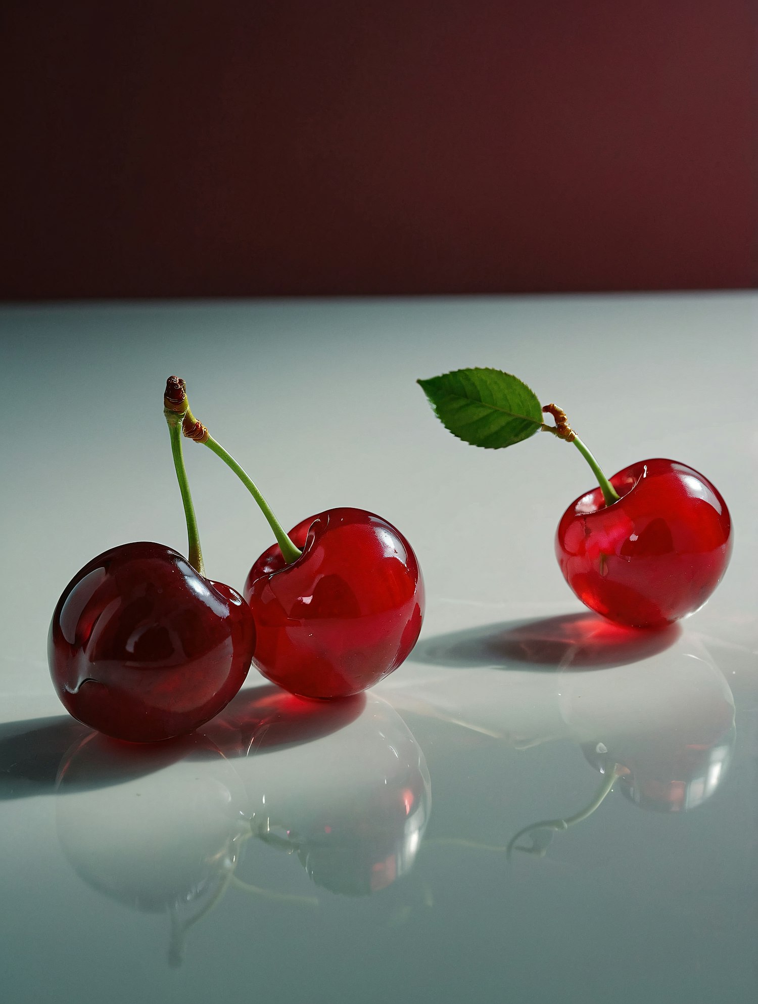 Glossy red cherries on a reflective surface with a muted background, showcasing vibrant colors and soft lighting.