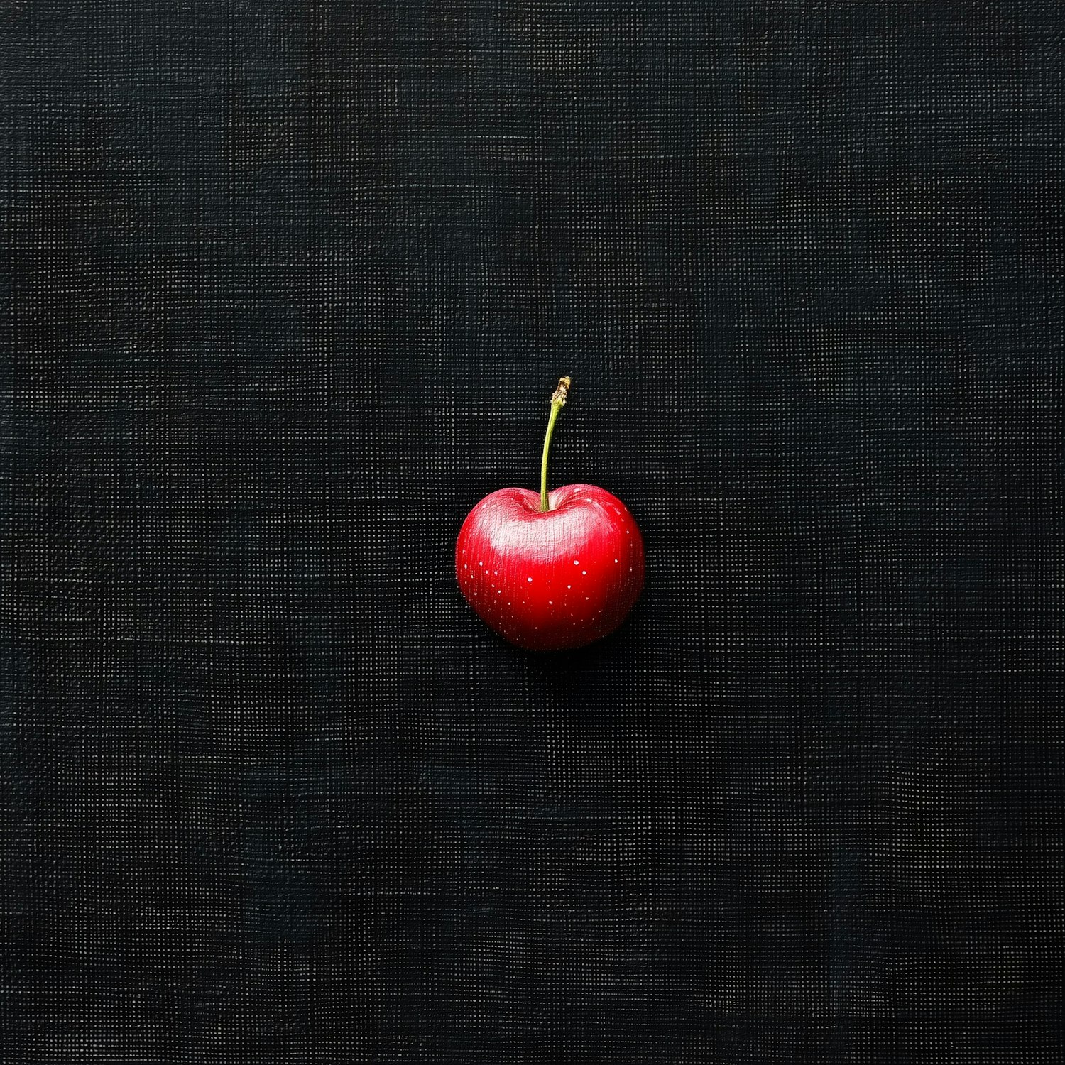A single glossy red cherry with a green stem on a textured black background, creating a bold and minimalist aesthetic.
