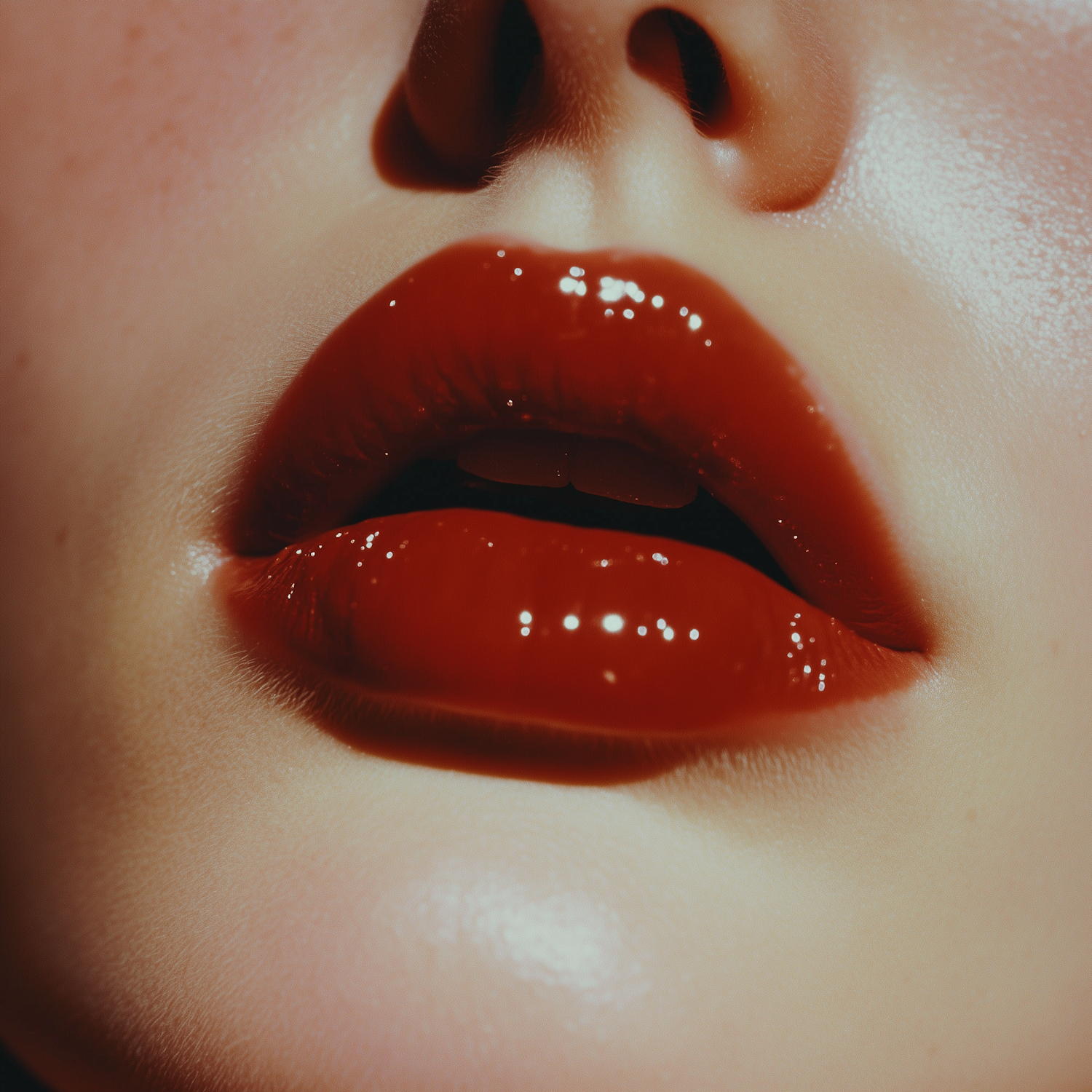 Close-up of glossy red lips with smooth skin and subtle freckles, highlighting bold lipstick and radiant texture.