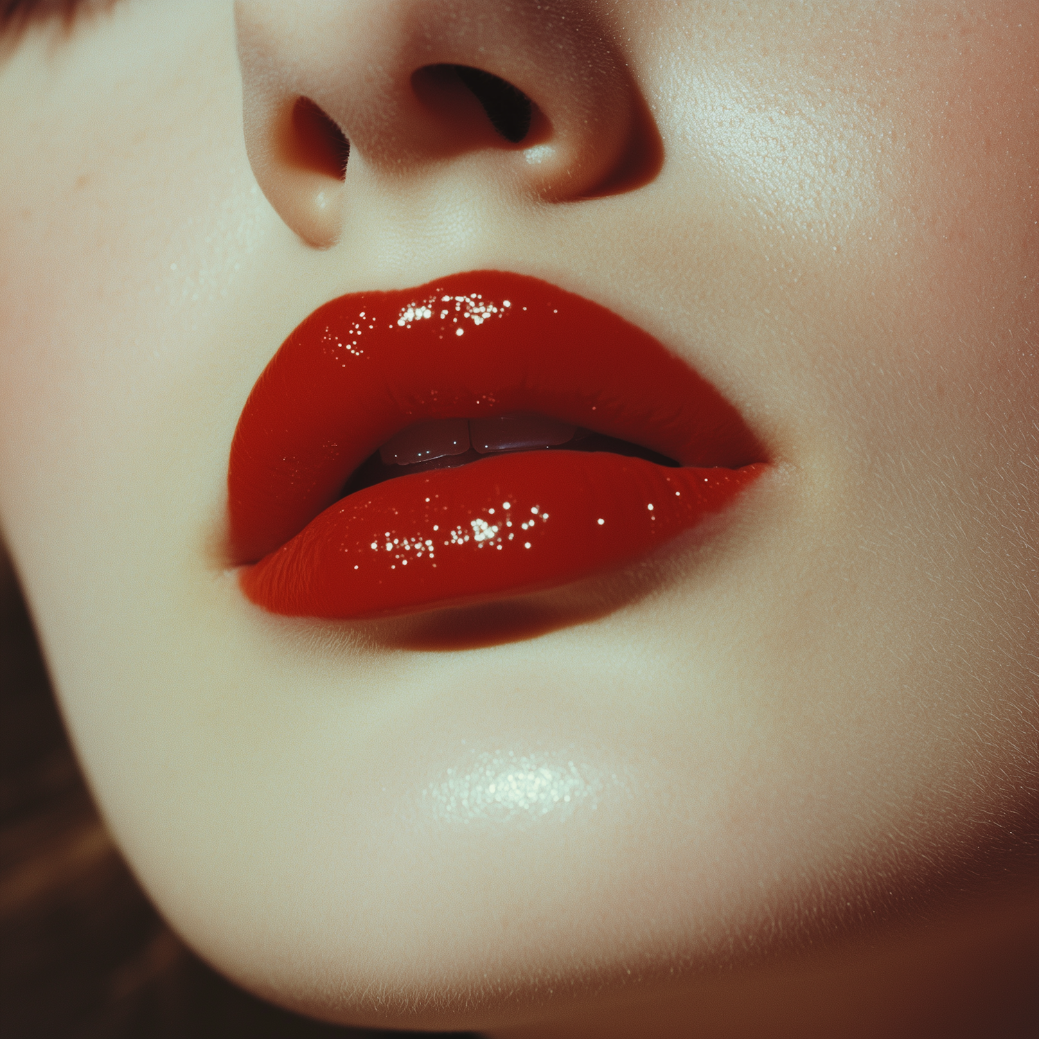 Close-up of glossy red lips with smooth, glowing skin. Perfect for beauty and makeup inspiration or showcasing vibrant lipstick shades.