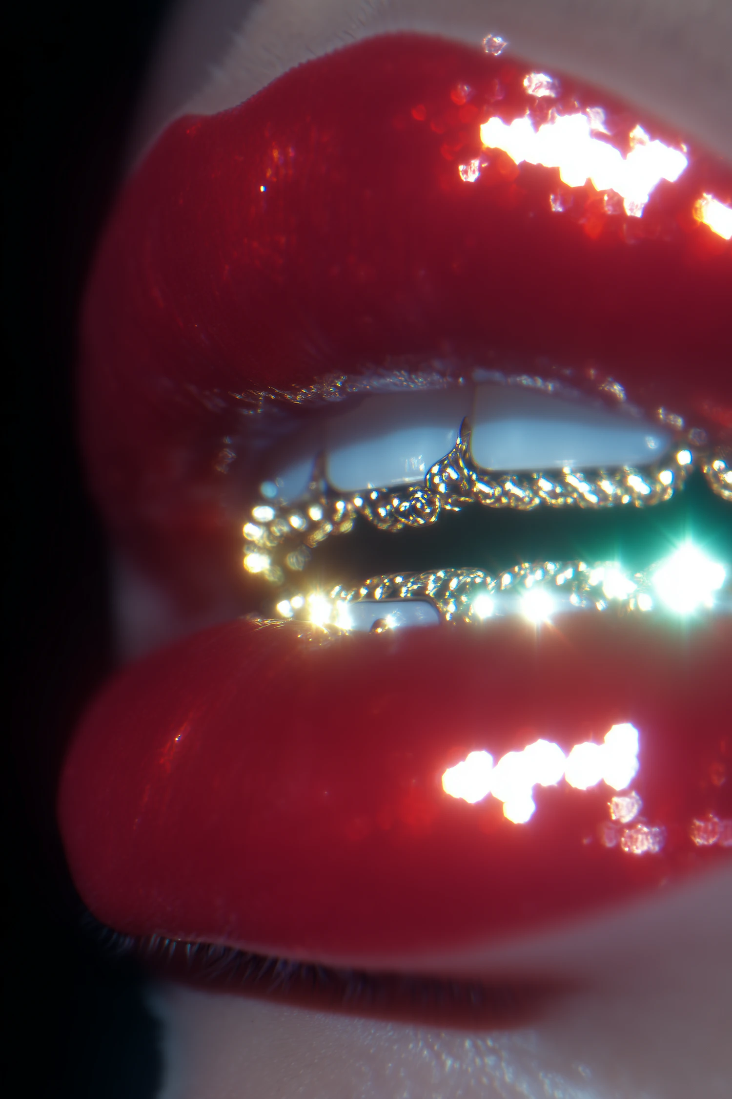 Close-up of glossy red lips with sparkling jewelry on teeth, creating a bold and glamorous visual impact against a dark background.