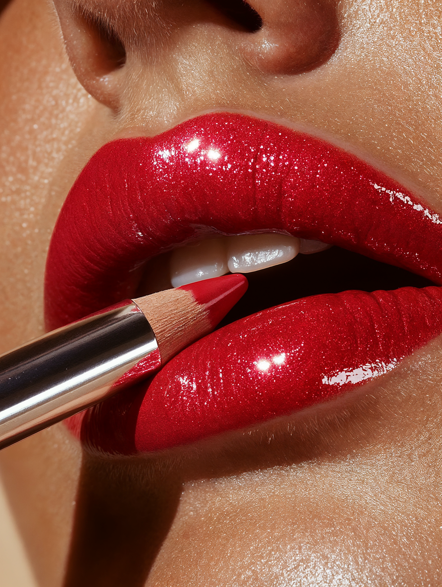 Close-up of glossy red lips with shimmering lipstick and a matching lip liner being applied, creating a bold and polished look.