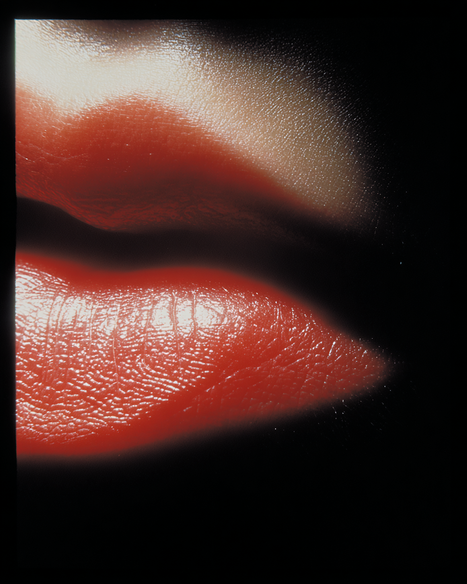 Close-up of glossy red lips against a dark background, showcasing vibrant color and detailed texture.