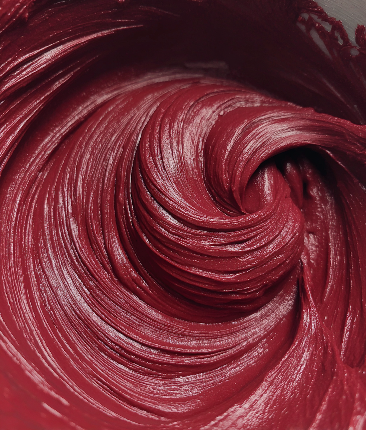 Close-up of a swirling, glossy red substance with a rich texture, showcasing its smooth and creamy consistency.