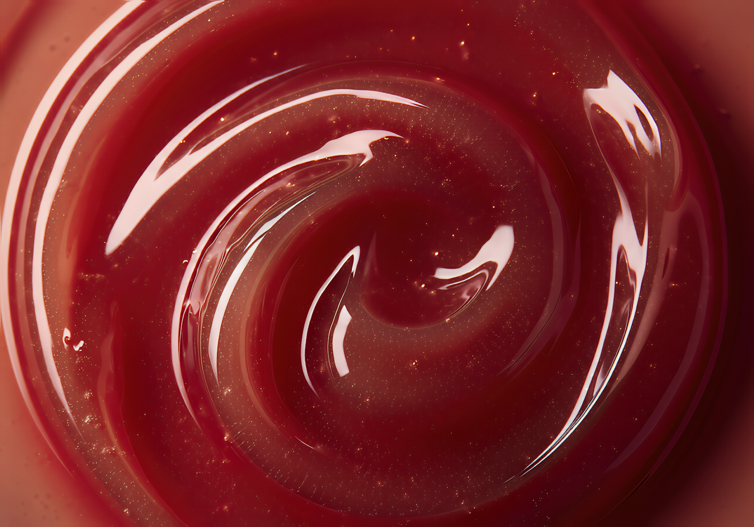 Close-up of a glossy red swirl with reflective highlights and sparkles, creating a mesmerizing and abstract visual effect.