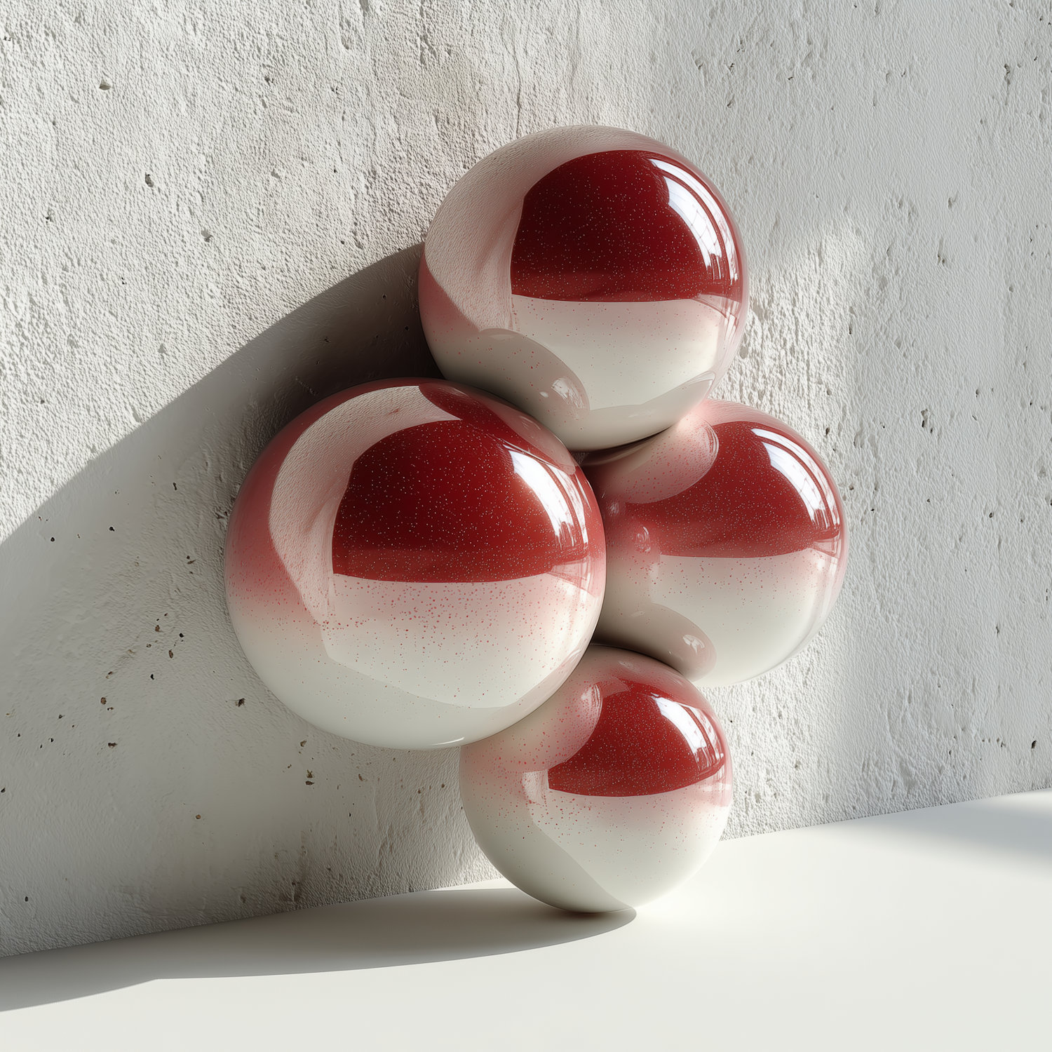 Cluster of glossy red and white spheres against a textured white wall, showcasing a minimalist and modern aesthetic.