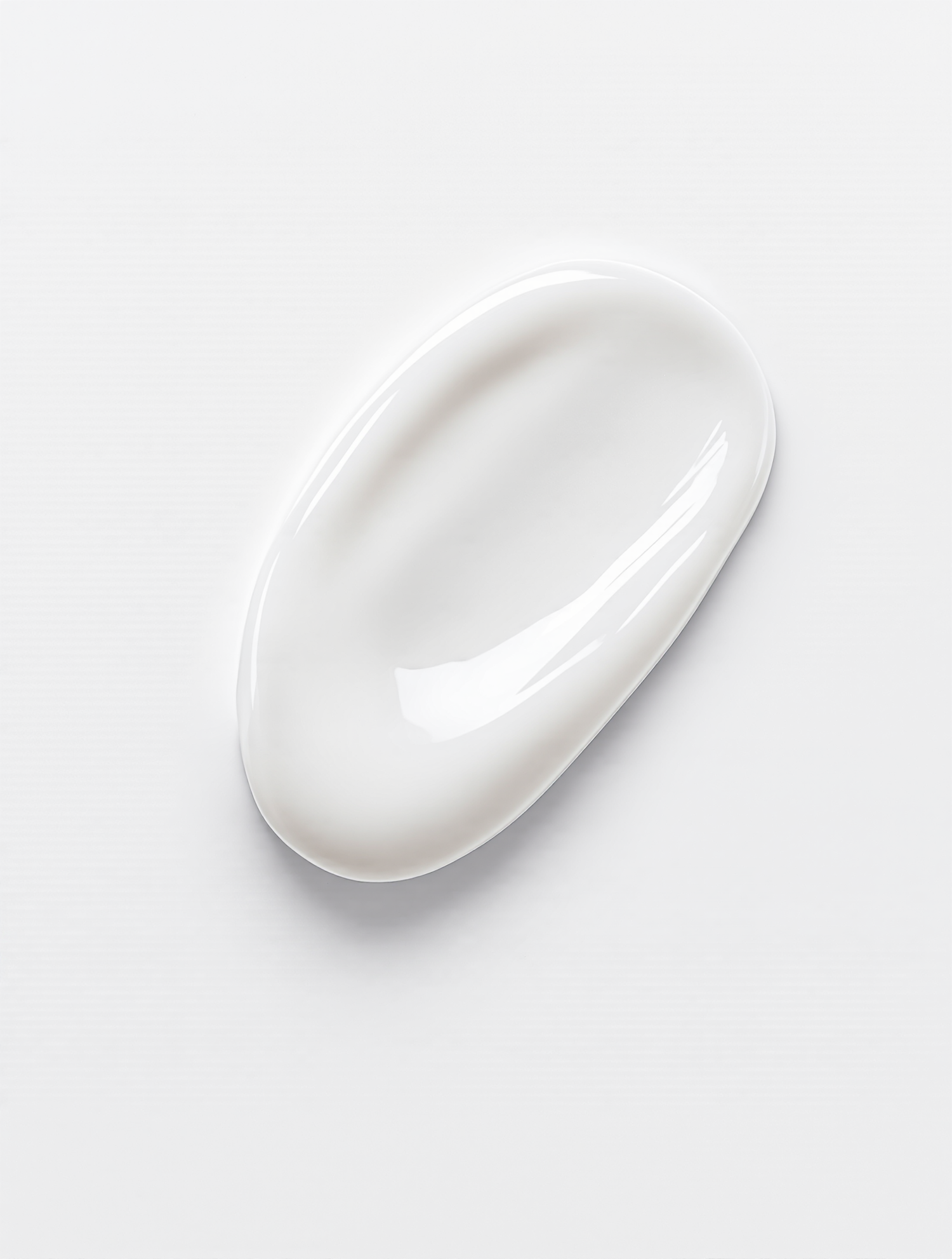A smooth, glossy white cream or lotion spread on a clean white surface, showcasing its silky texture and uniform appearance.