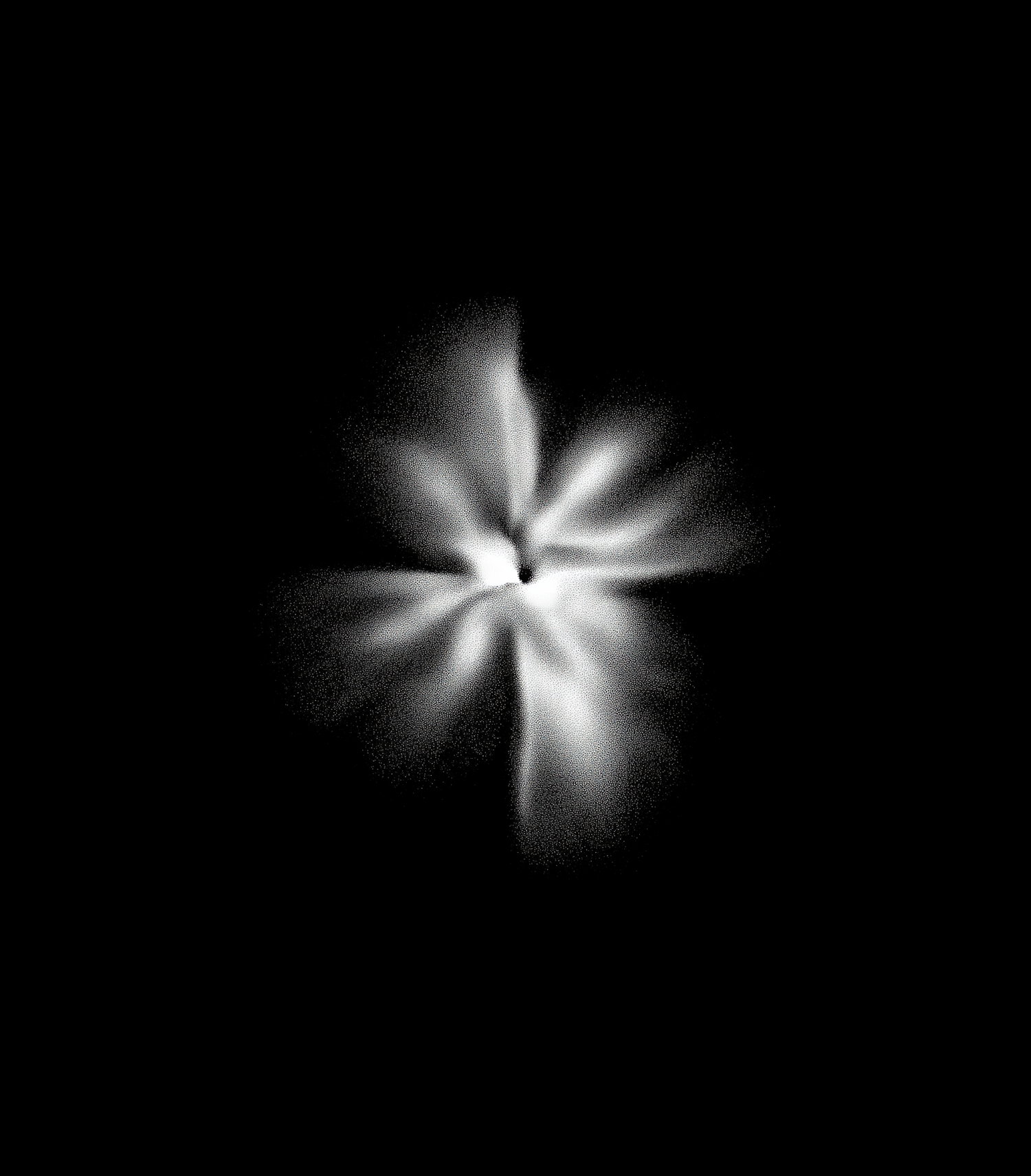 Abstract black-and-white image with a glowing, flower-like shape radiating soft light against a dark background.