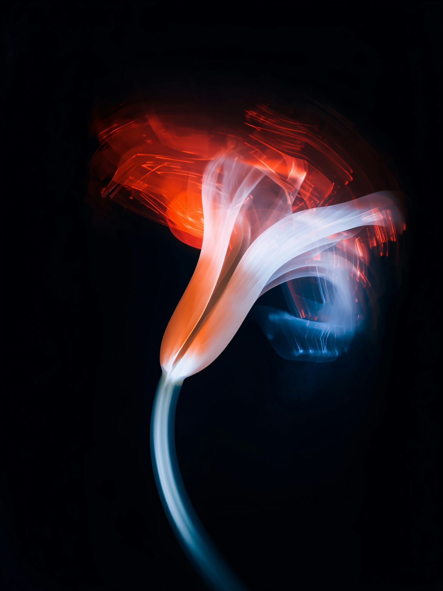 Abstract glowing flower-like form with vibrant orange, red, and blue hues against a black background, creating a dynamic visual effect.