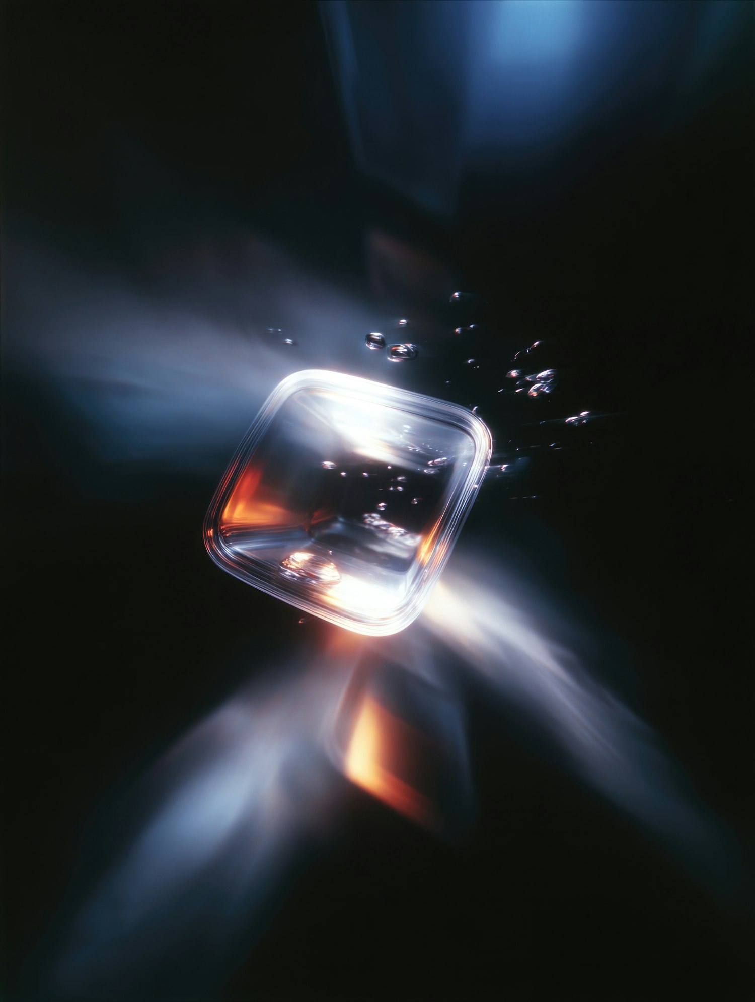 A glowing transparent rectangle emits radiant blue, white, and orange light in a dark space, surrounded by floating bubbles.