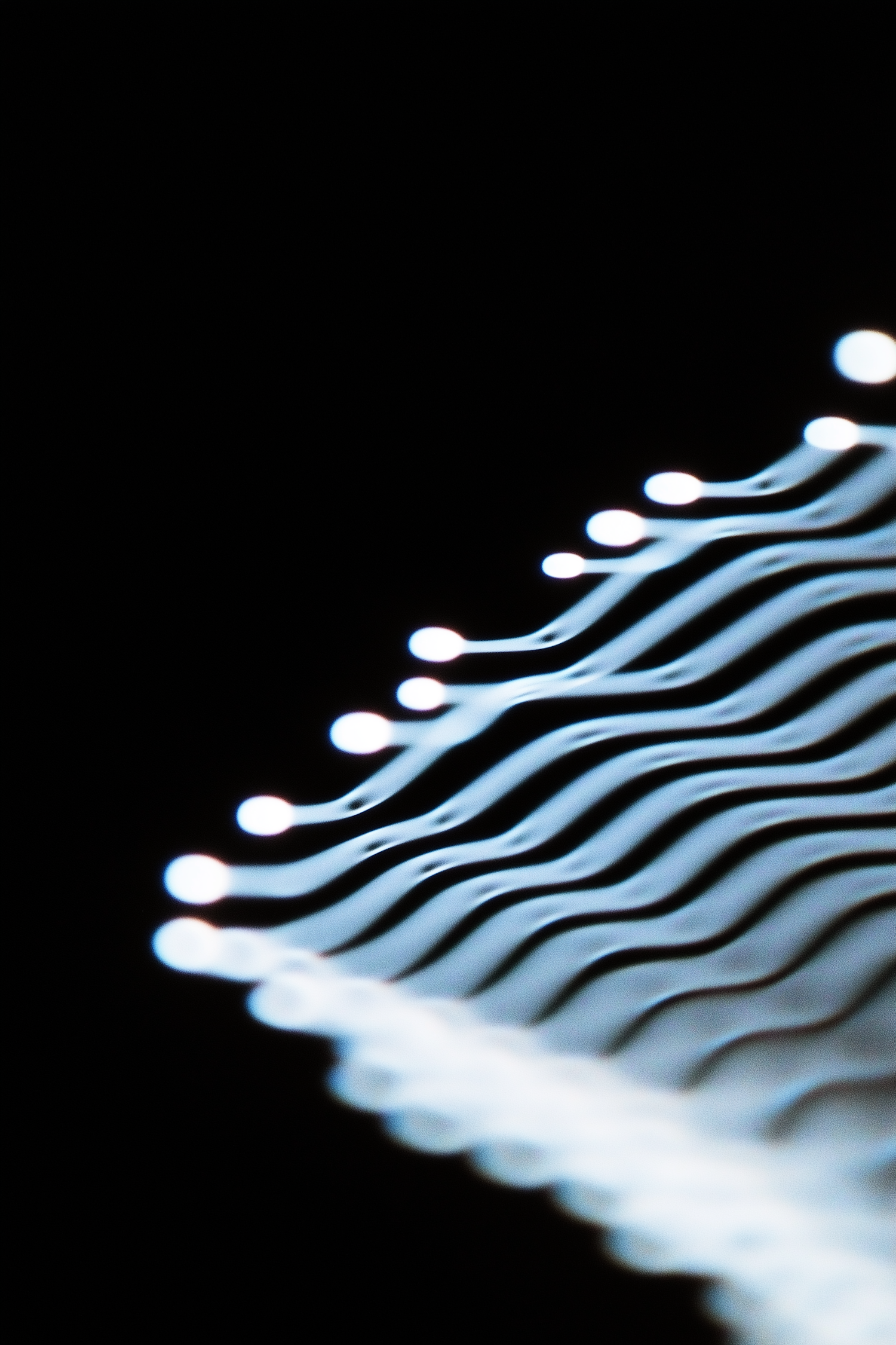 Abstract glowing white dots and wavy lines on a black background, creating a futuristic and flowing pattern with a sense of depth.