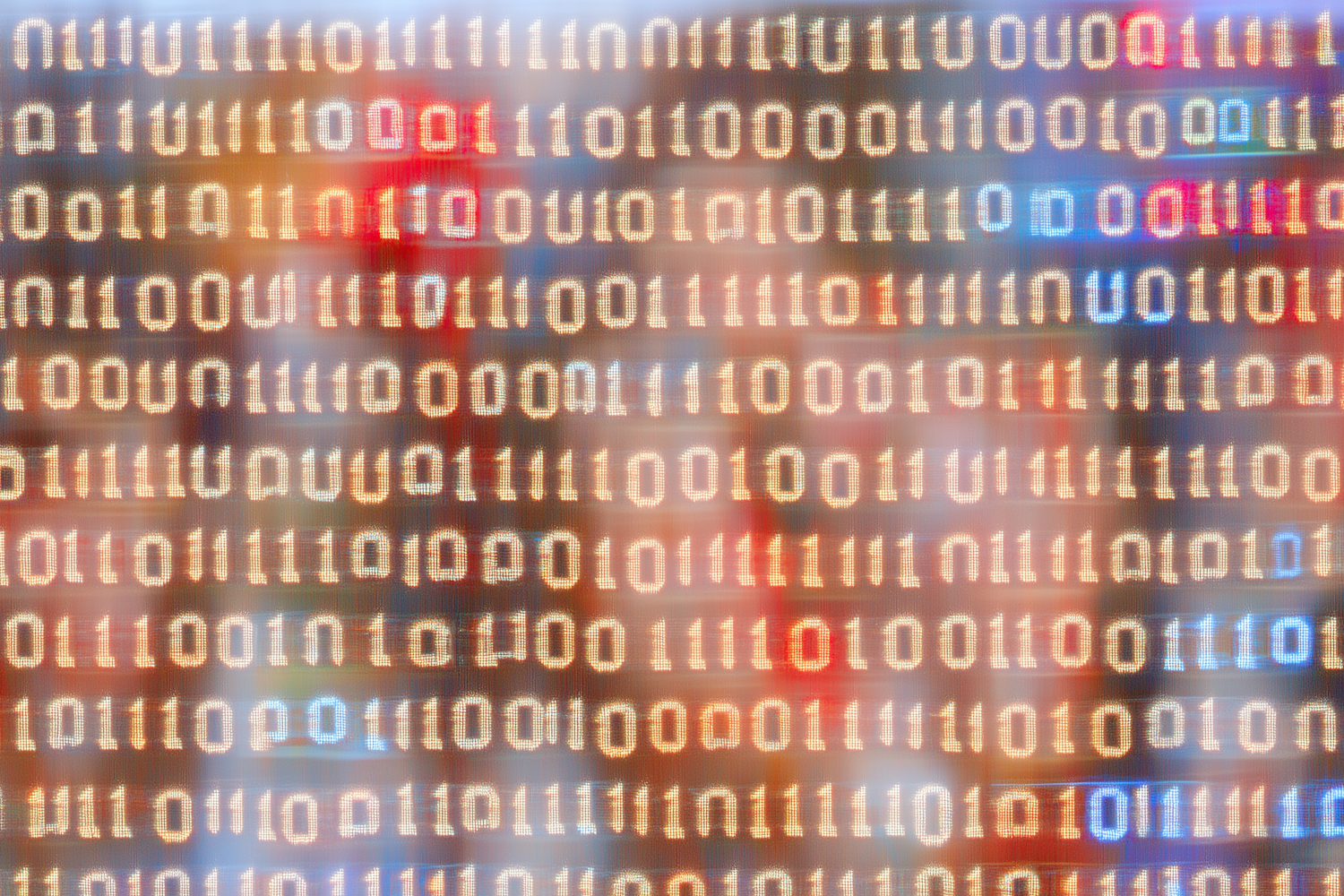 Glowing binary code in warm tones over a blurred, colorful background, evoking themes of technology and data.