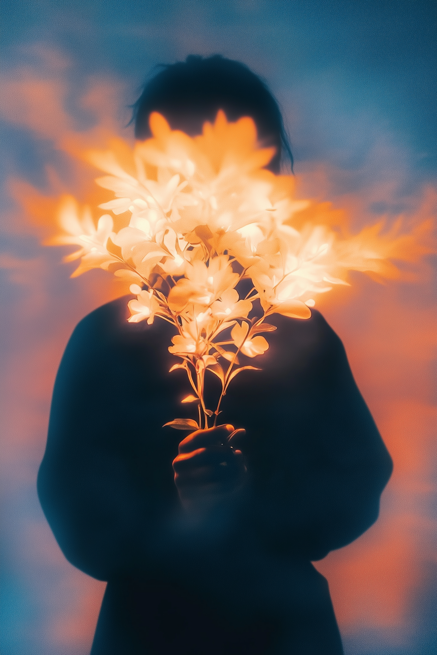 A mysterious silhouette holds a glowing bouquet of flowers, radiating warm orange light against a dreamy blue and orange background.