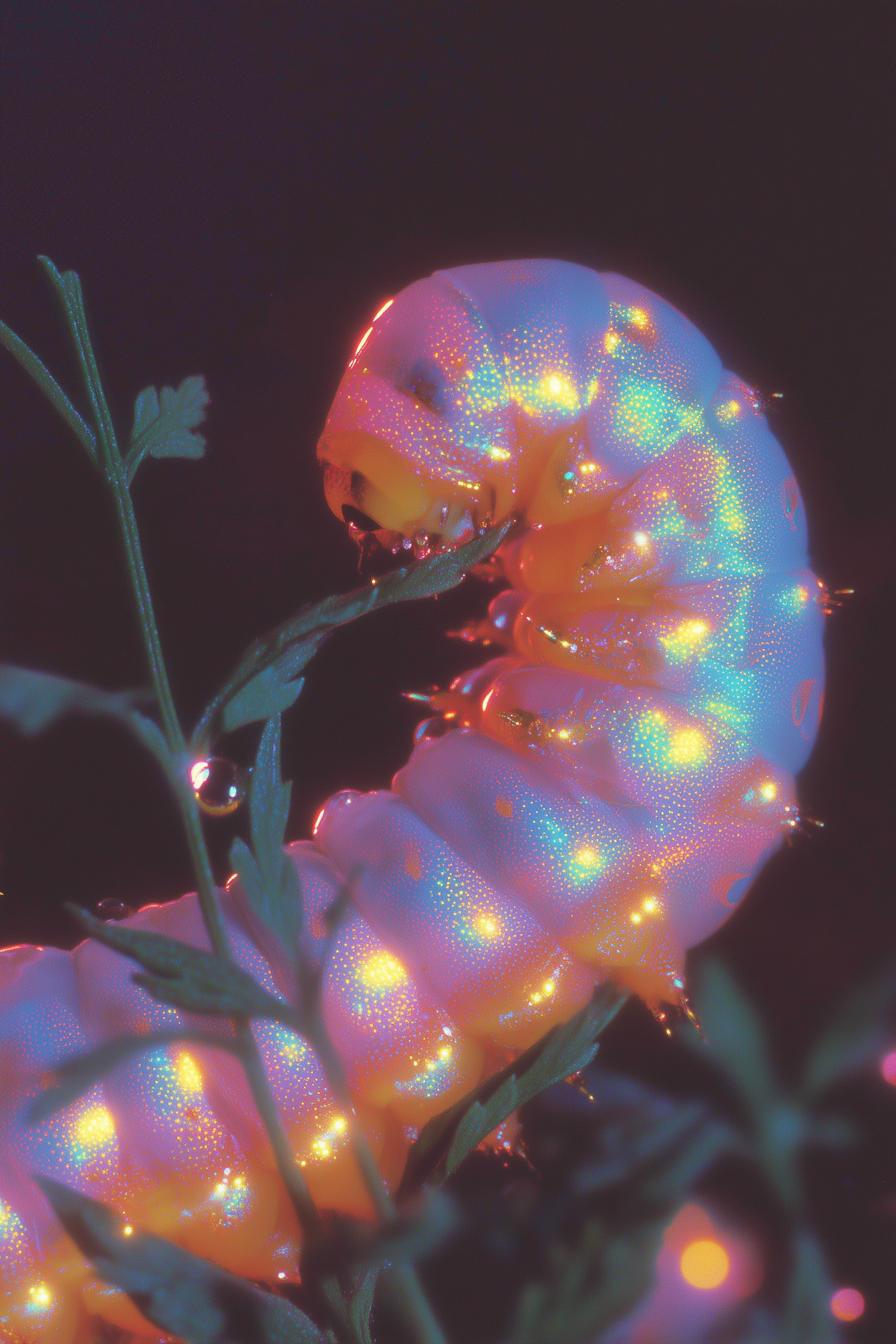 A glowing, iridescent caterpillar on a plant stem with vibrant colors and sparkling textures against a dark background.