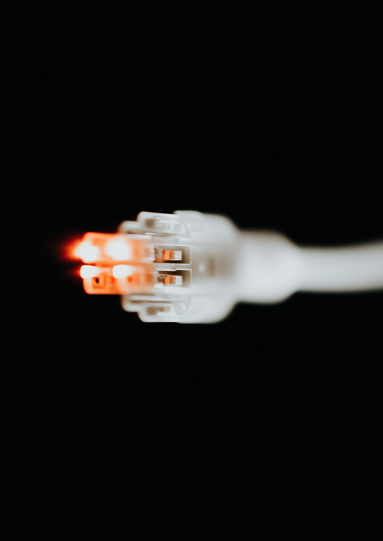 Close-up of a white electrical connector with glowing orange lights, set against a black background for a striking tech-inspired look.
