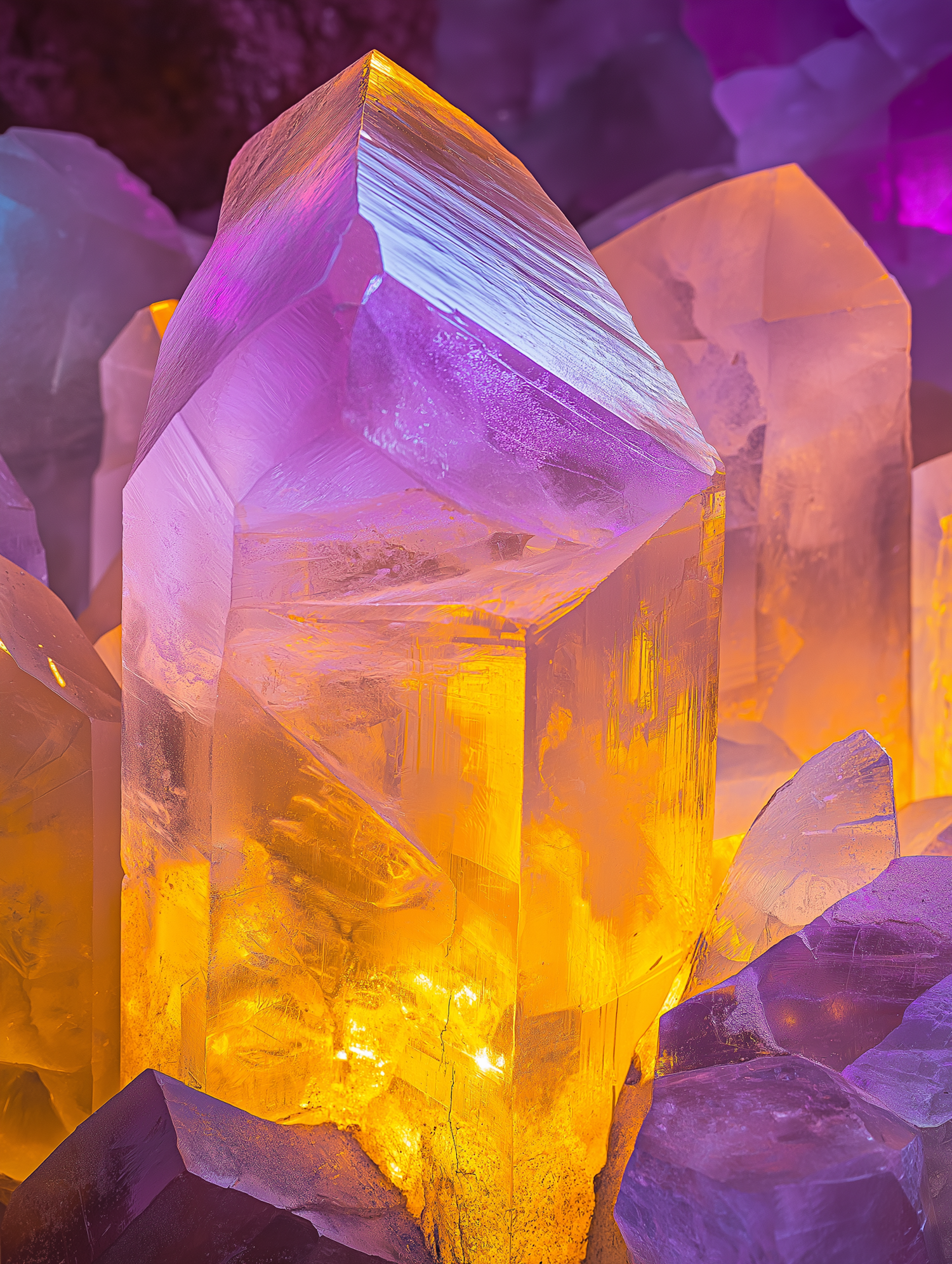 Vibrant crystal cluster with glowing purple and orange hues, creating an ethereal and captivating visual effect.