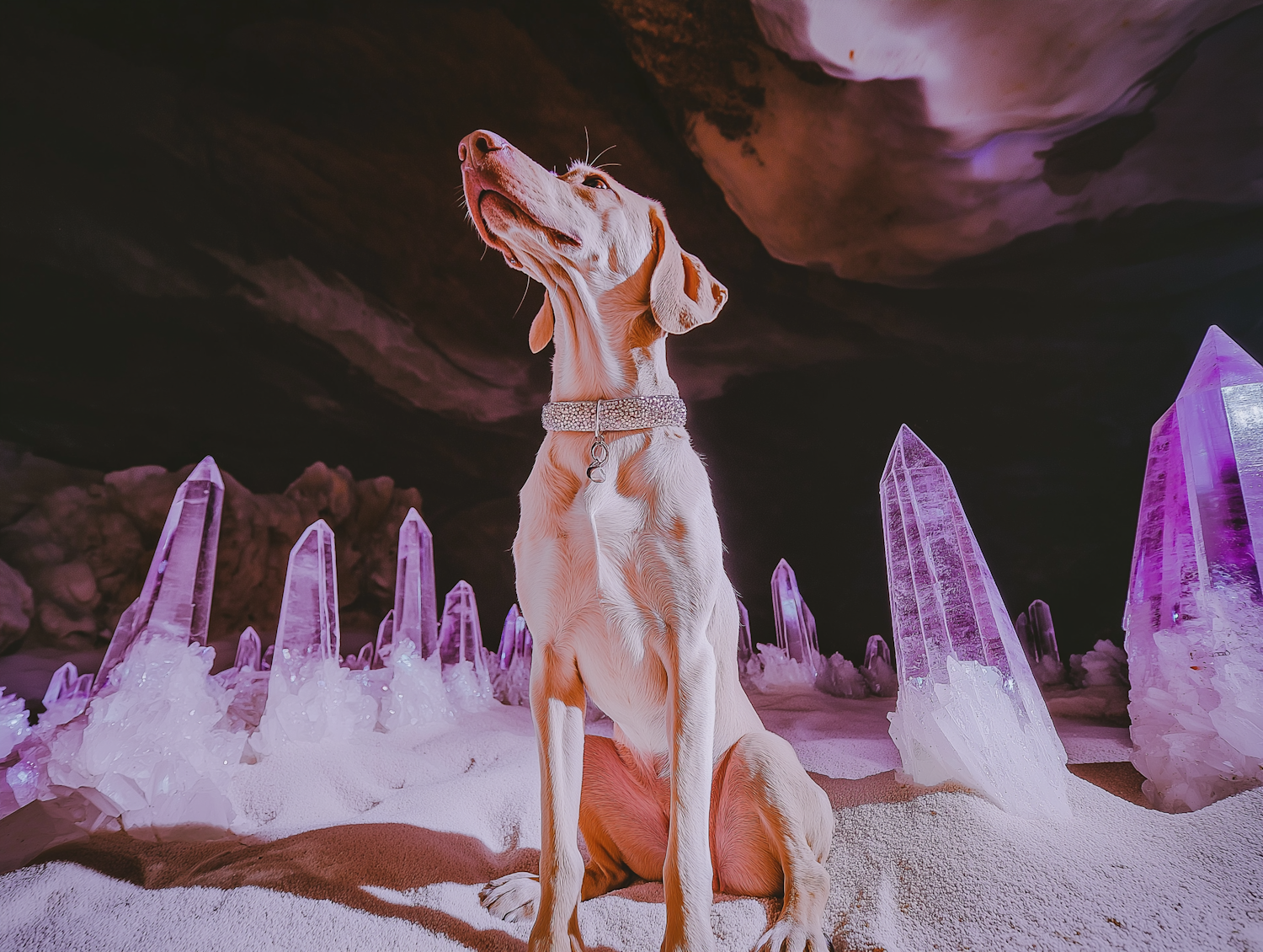 A majestic dog sits among glowing purple crystals, wearing a sparkling collar in a mystical, dimly lit environment.