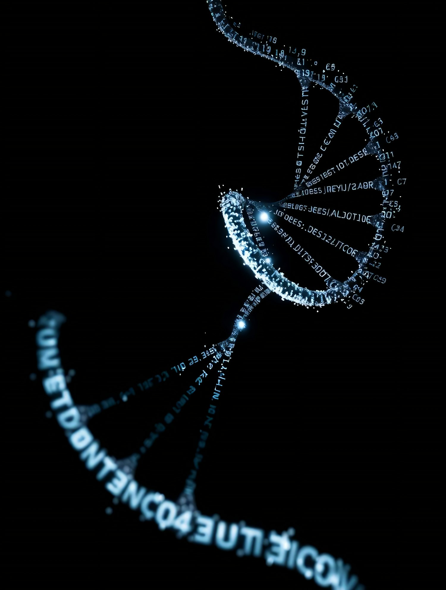 A glowing digital DNA helix made of alphanumeric characters, symbolizing genetic data, set against a dark background.
