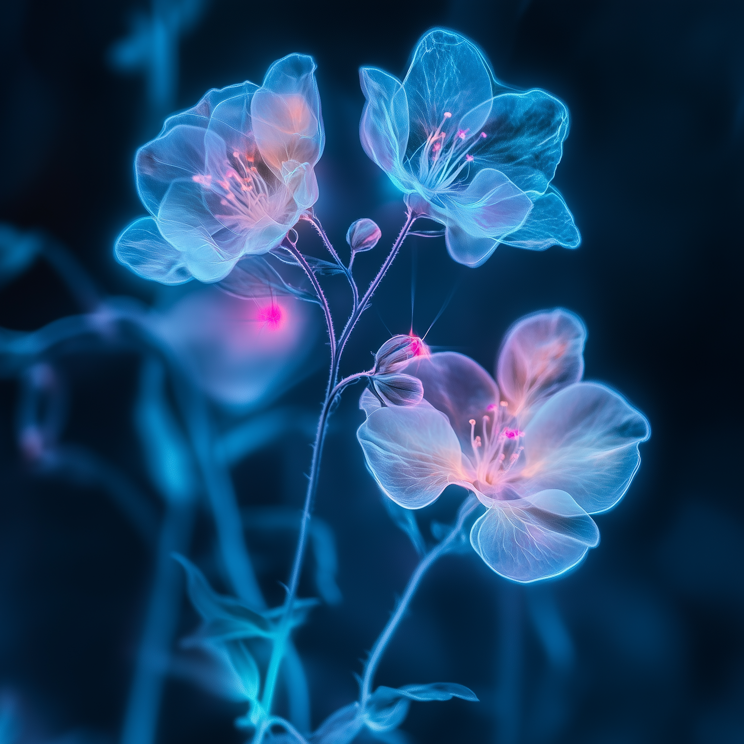 Ethereal glowing flowers with neon blue and pink hues, set against a dark, dreamy background. A surreal and magical floral scene.
