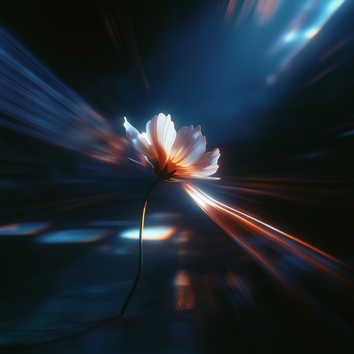 A glowing white flower with radiant light streaks in a surreal, dark background. Ethereal and dreamlike, perfect for artistic inspiration.