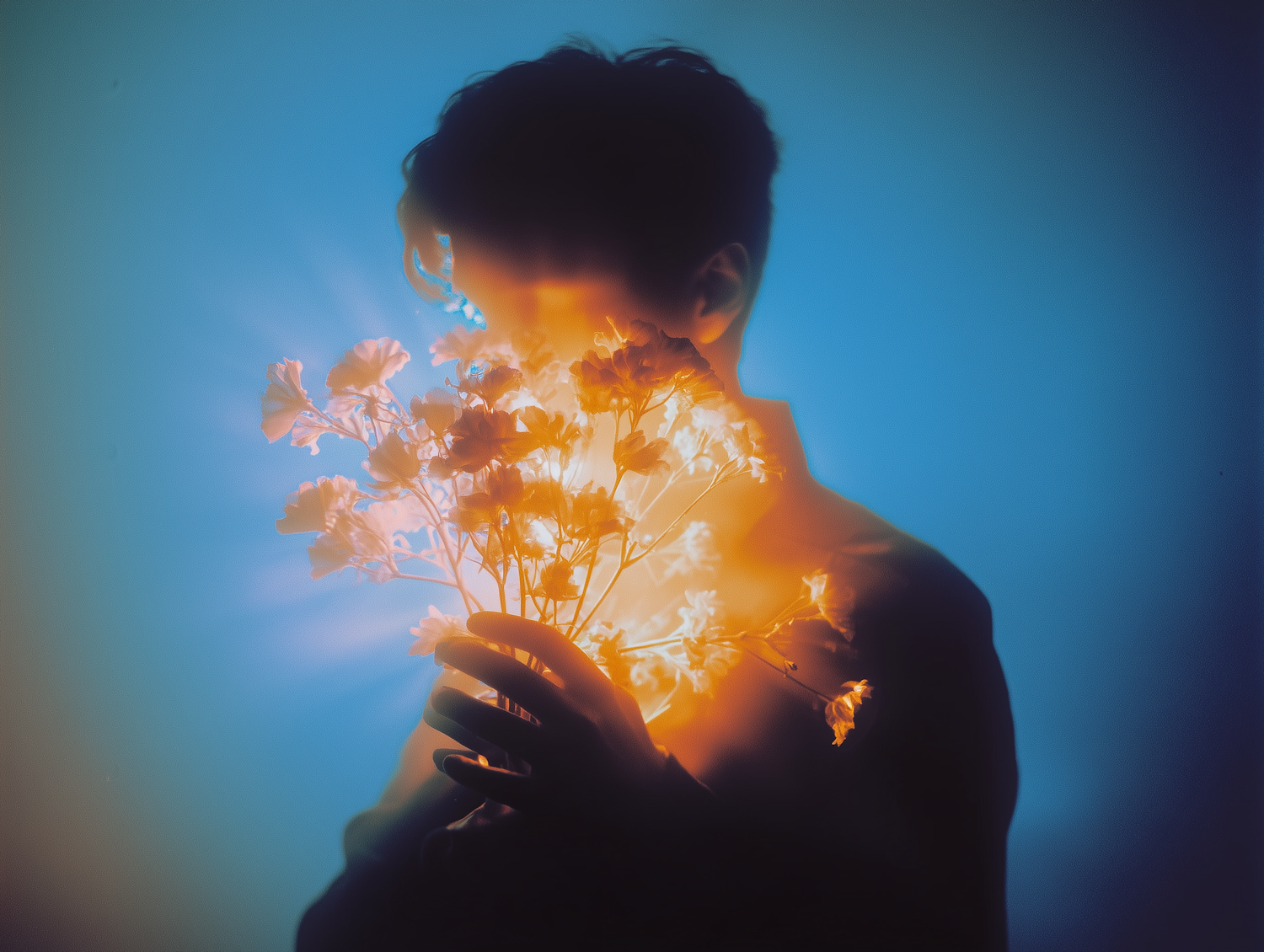 A mysterious silhouette holding glowing flowers radiating golden light against a vibrant blue background, creating a surreal and dreamy vibe.