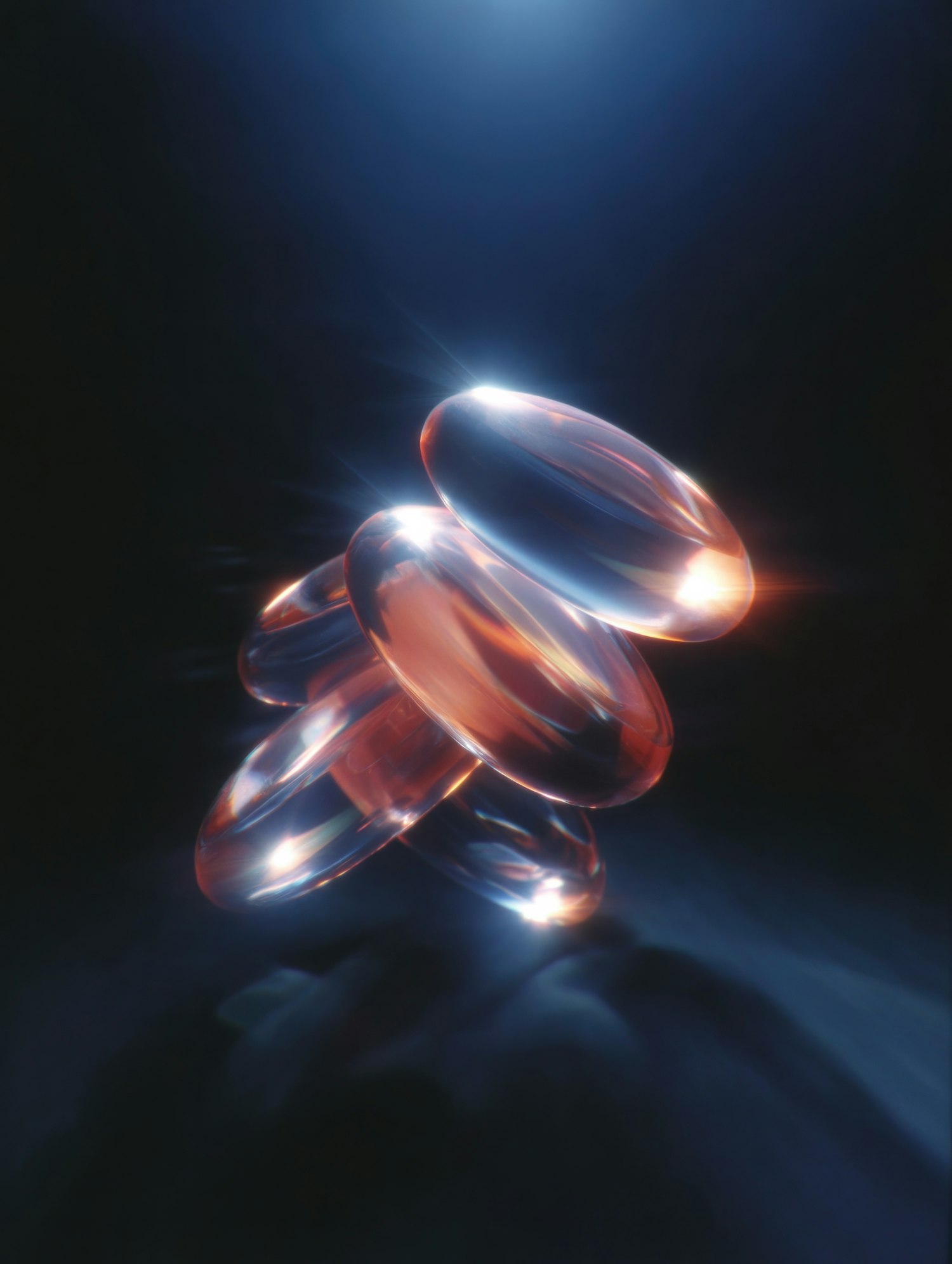 Glowing translucent rings with warm hues float in a dark, ethereal space, creating a surreal and mesmerizing visual effect.