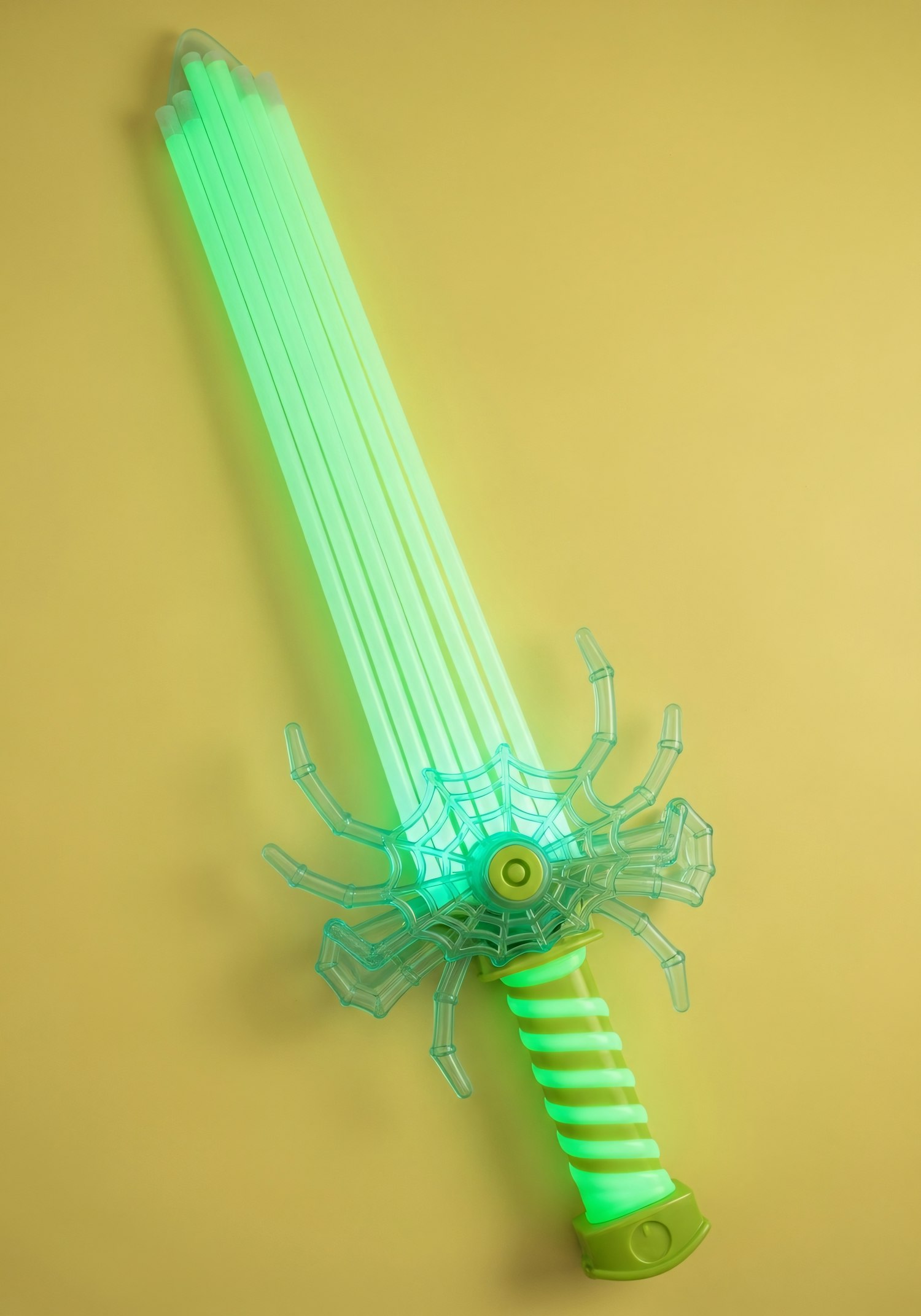 A glowing green toy sword with a spiderweb hilt and striped handle, set against a yellow background.