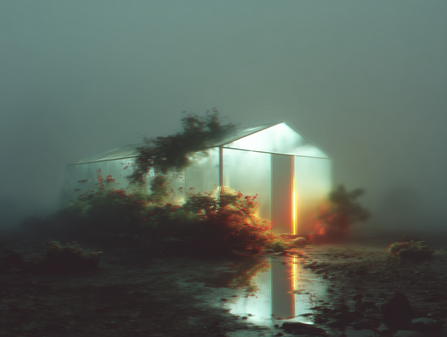 A glowing greenhouse in a misty, surreal landscape, surrounded by vegetation and reflected in wet ground, creating a mysterious atmosphere.